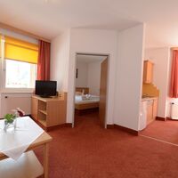 The suites are also fitted with a kitchenette (fridge, crockery, dining area), living-sleeping room and a bedroom.