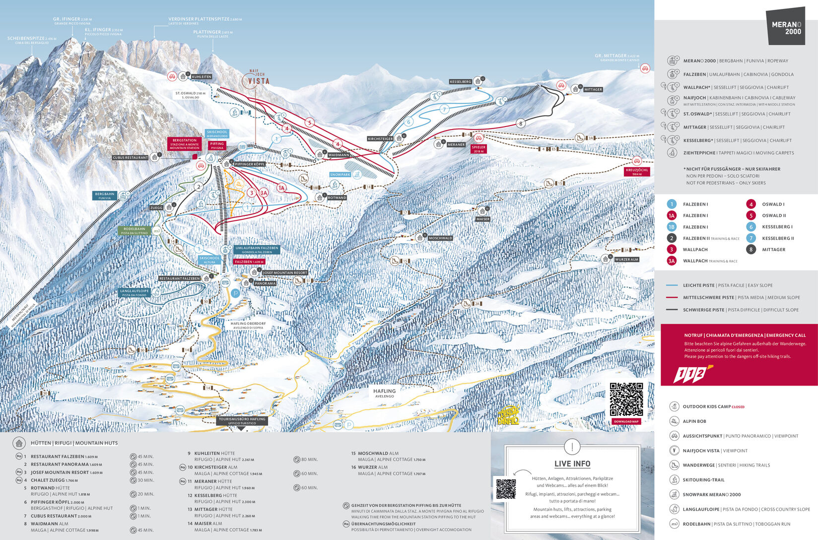 Snowpark Meran 2000Im hinteren Bereich des Skigebietes, auf der Oswaldpiste bei der Waidmannalm, erwartet mutige Snowboarder und Freestyler der Snowpark Meran 2000.Ein ambitioniertes Projekt mit mehreren Kickers, Rails, Tubes und Boxes, damit jeder auf seine Kosten kommt. Die Jump-Zone ist von der Bergstation der Seilbahn mit dem Sessellift Piffing erreichbar. |
