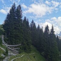 Von der Soiernspitze geht es nun abwärts hinab zur Vereiner-Alm (Wegweiser "Vereiner-Alm"). Der Abstieg erfolgt in, teilweise steilen, Serpentinen, die stellenweise etwas rutschig sein können. Von der Vereiner-Alm geht es über einen einfachen Schotterweg zurück zum Isarhorn (bzw. zum Wanderparkplatz Seinsbach) (Beschilderung "Krün").