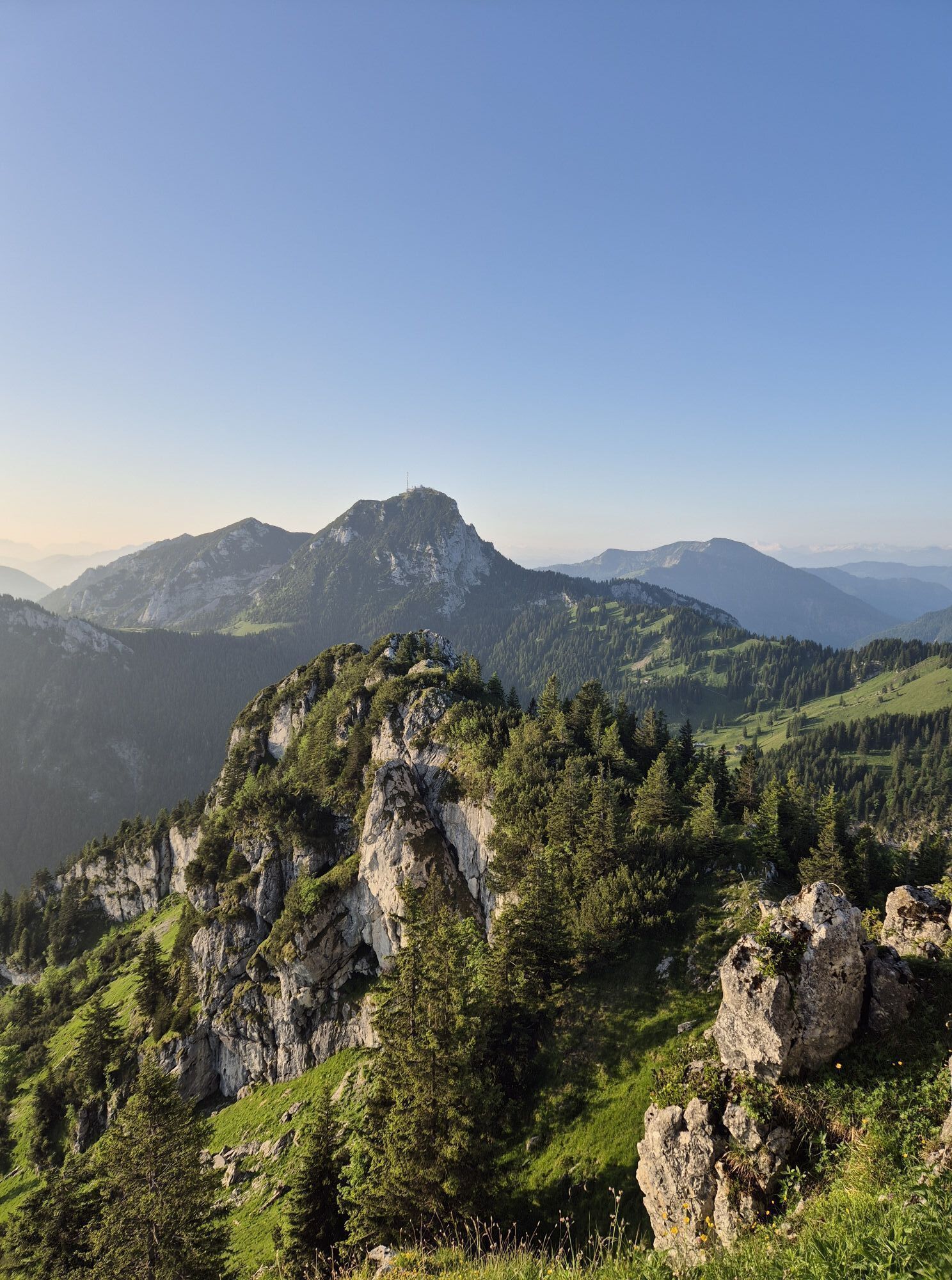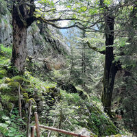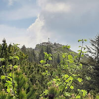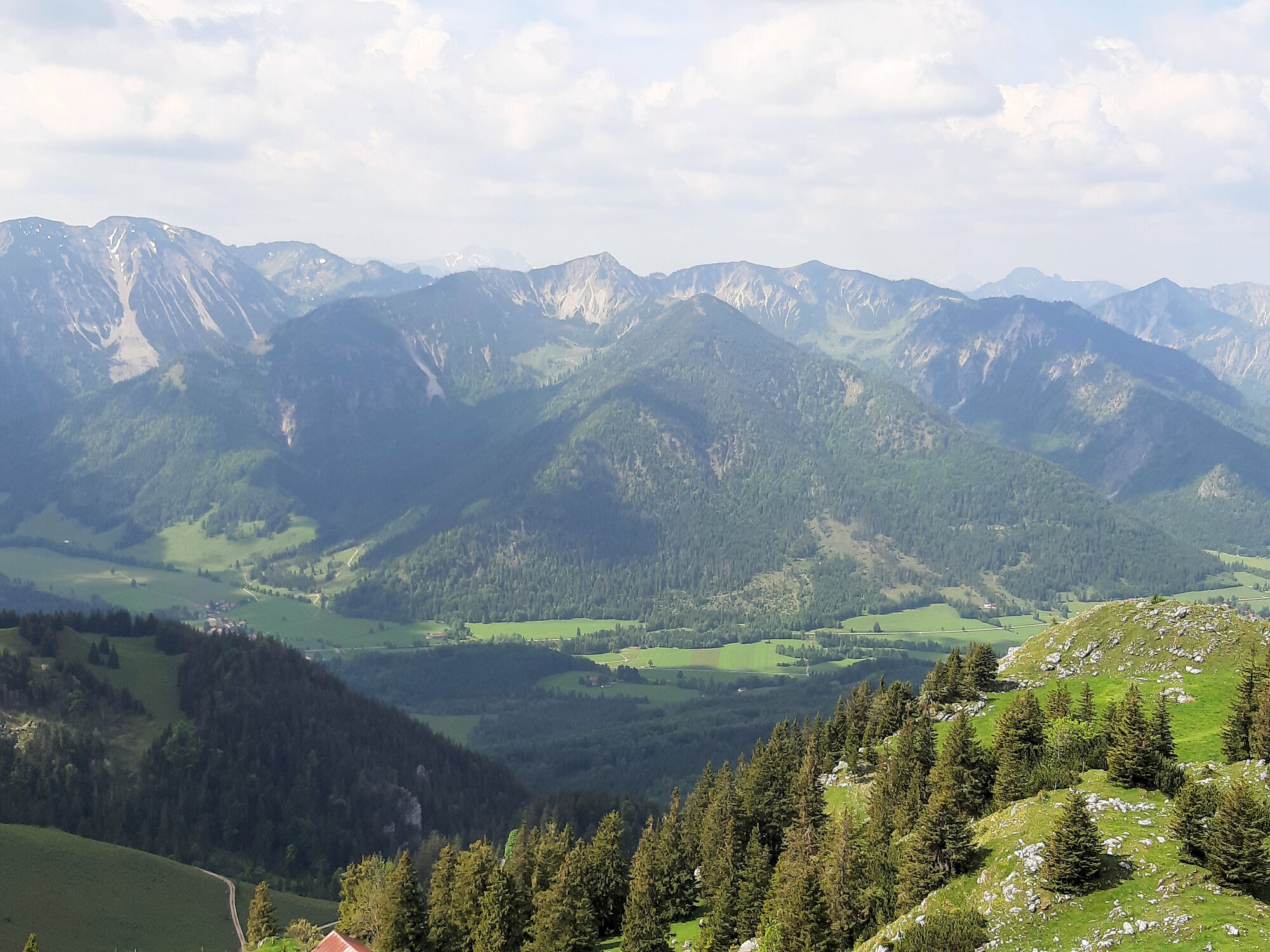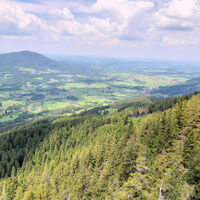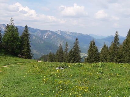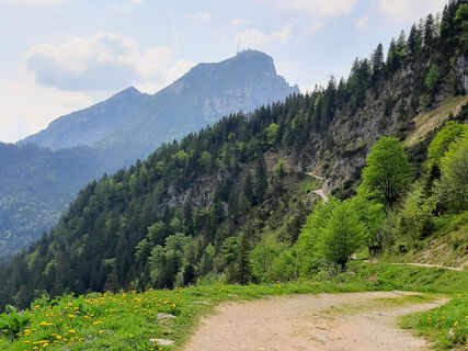 Vom großen Wanderparkplatz in Birkenstein gehen wir am Oberwirt vorbei und auf einem Fahrweg nach Norden hinauf. Zunächst steigt er nur relativ flach im Wald an. Dann dreht er an einer versetzten Kreuzung...