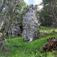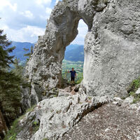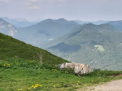 Der Abstieg erfolgt vom Gipfel aus gegen Südwesten über einen kleinen Steig rechts. Wir queren einen Wiesenhang und erreichen das Gipfelkreuz des Bocksteins. Vom Bockstein gehen wir südwärts in einen breiten Sattel, halten uns erst links und zweigen dann nach ein paar Metern nach rechts ab auf einen Steig ab (schwer zu finden). Dabei muss man nun gewissenhaft der Trittspur folgen, die ziemlich steil zum beeindruckenden Birkensteinfensterl abfällt und oftmals schwer zu erkennen ist. Hier hat man einen wunderschönen Blick Richtung Leitzachtal. Vom Fensterl geht es steil Richtung Süden hinunter und auf einen flacheren, breiten Querweg. Diesem folgen wir nach rechts, verlassen ihn aber bald wieder auf einem Steig nach links, der in der Nähe des Sattelbachs talwärts führt. Schließlich stoßen wir wieder auf die Kreuzung der Aufstiegsroute, die zurück nach Birkenstein führt.