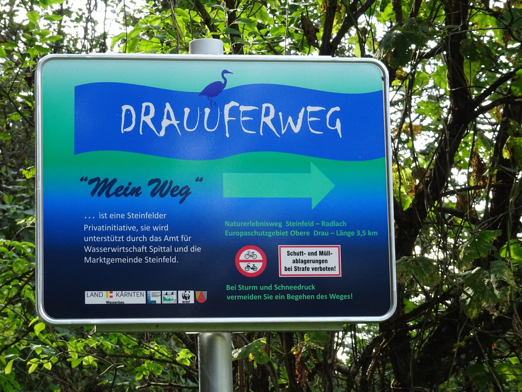 Der Ausgangspunkt liegt ca. 200 m von der Steinfelder Draubrücke entfernt, danach verläuft der Drauuferweg parallel zum bestehenden Drauradweg und der Drau bis an die Ostseite der Radlacher Gman, direkt neben einer kleinen Bucht, ca. 600 m entfernt vom Rastplatz Radlacher Draubrücke kommt man wieder auf den Feldweg.Begehen auf eigene Gefahr.