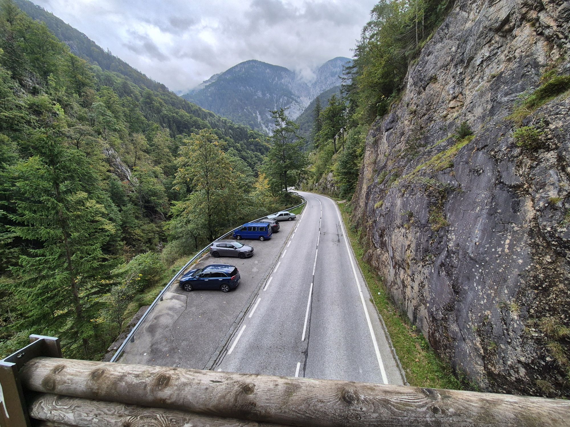 The tour starts here. After crossing the road, follow the well-signposted trail over small rocky steps toward the "Teufelsbadstubensteig." Do not take the turnoffs toward Wachtlhüttlkamm (this will be our ascent route)! The path leads along rock faces, secured in sections with steel cables, initially above and parallel to the road to the entrance to the Große Höllental. A bend to the left takes you to the valley, and then the view opens up to an imposing steel staircase: the Schönbrunnerstiege, which should be reached after about 10 minutes of hiking. Thanks to this staircase, the 60 meters of elevation gain can be overcome quite easily, although the length does represent a first test for the muscles.