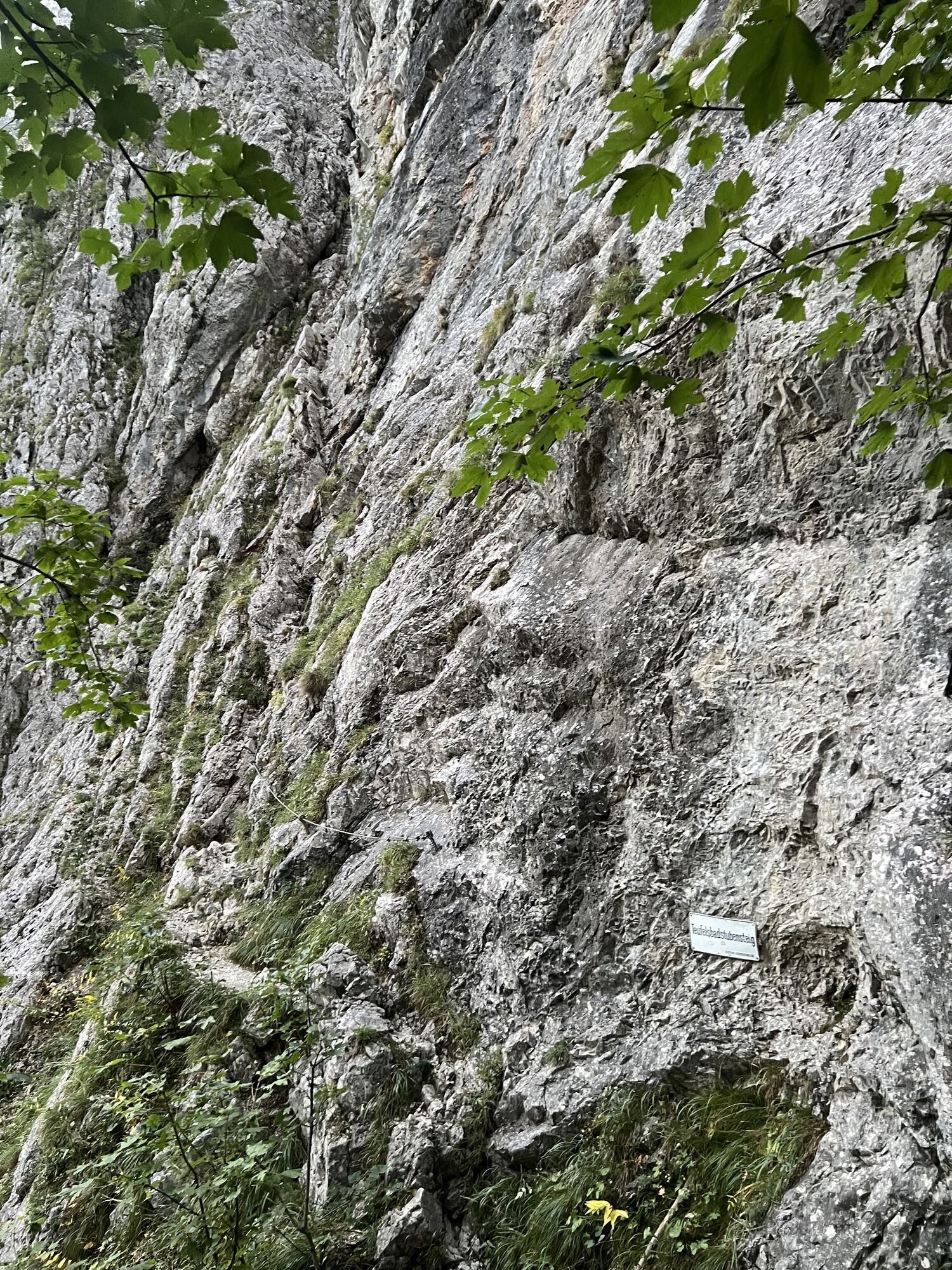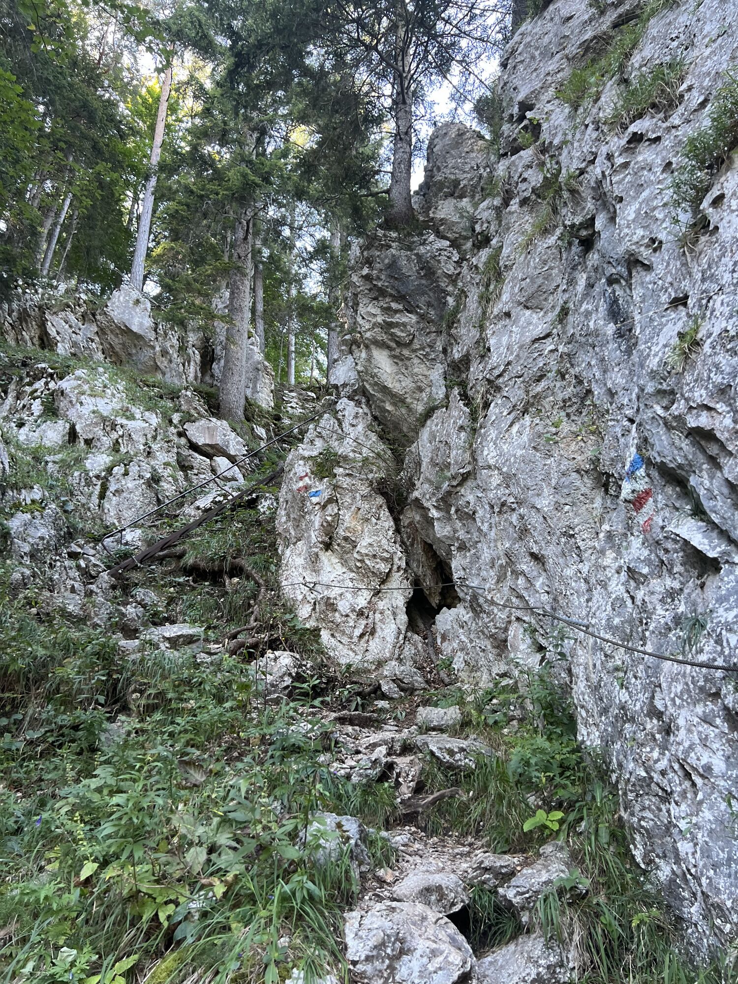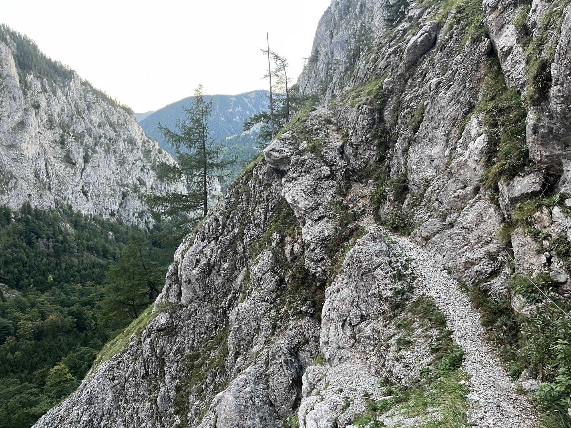After about 2.4 km (1.5 mi), or about 55 minutes, you reach the start of the Teufelsbadstubensteig. Immediately after the start, a ledge leads along the rock face to a gully, which has been secured with an iron ladder.