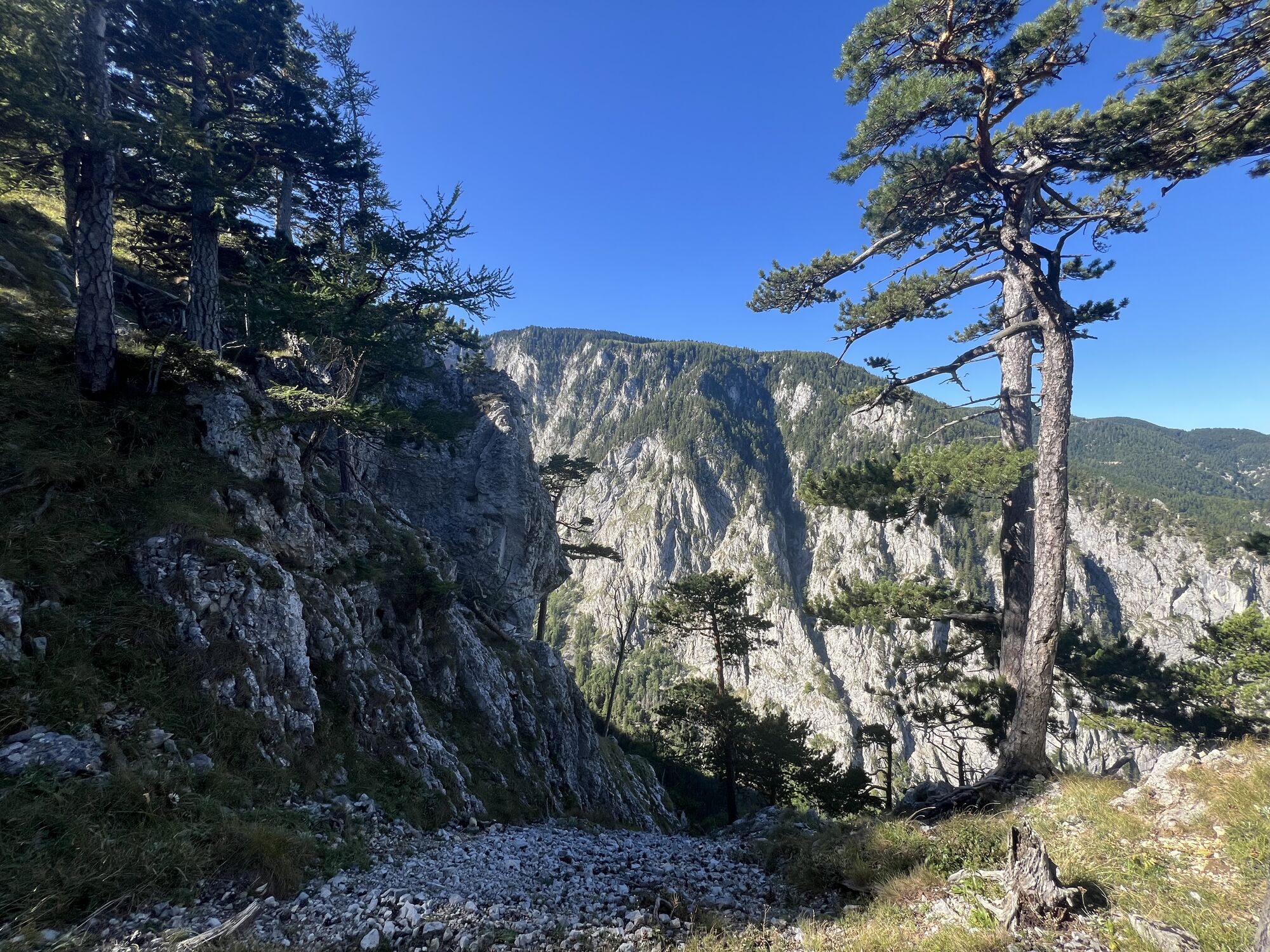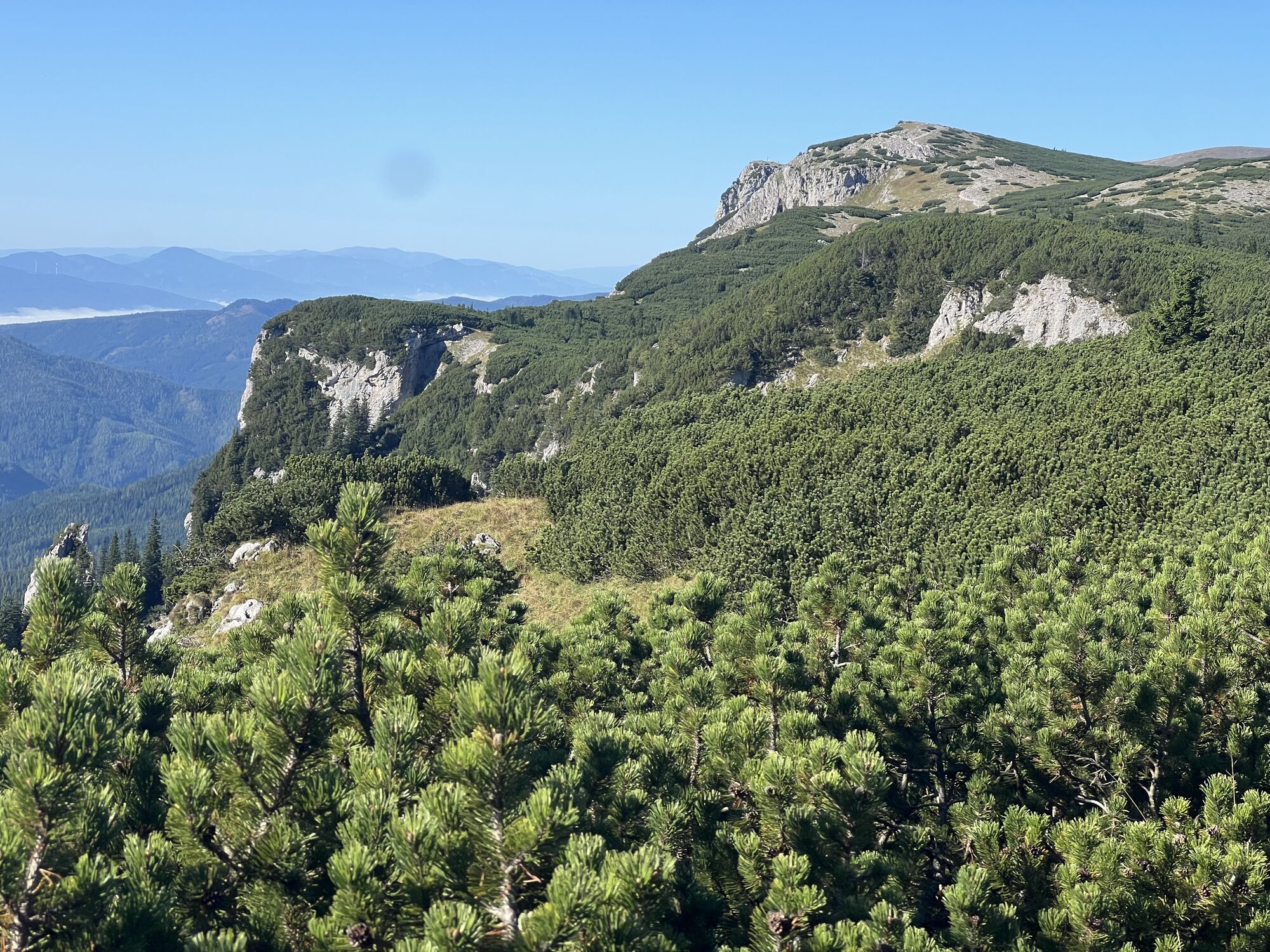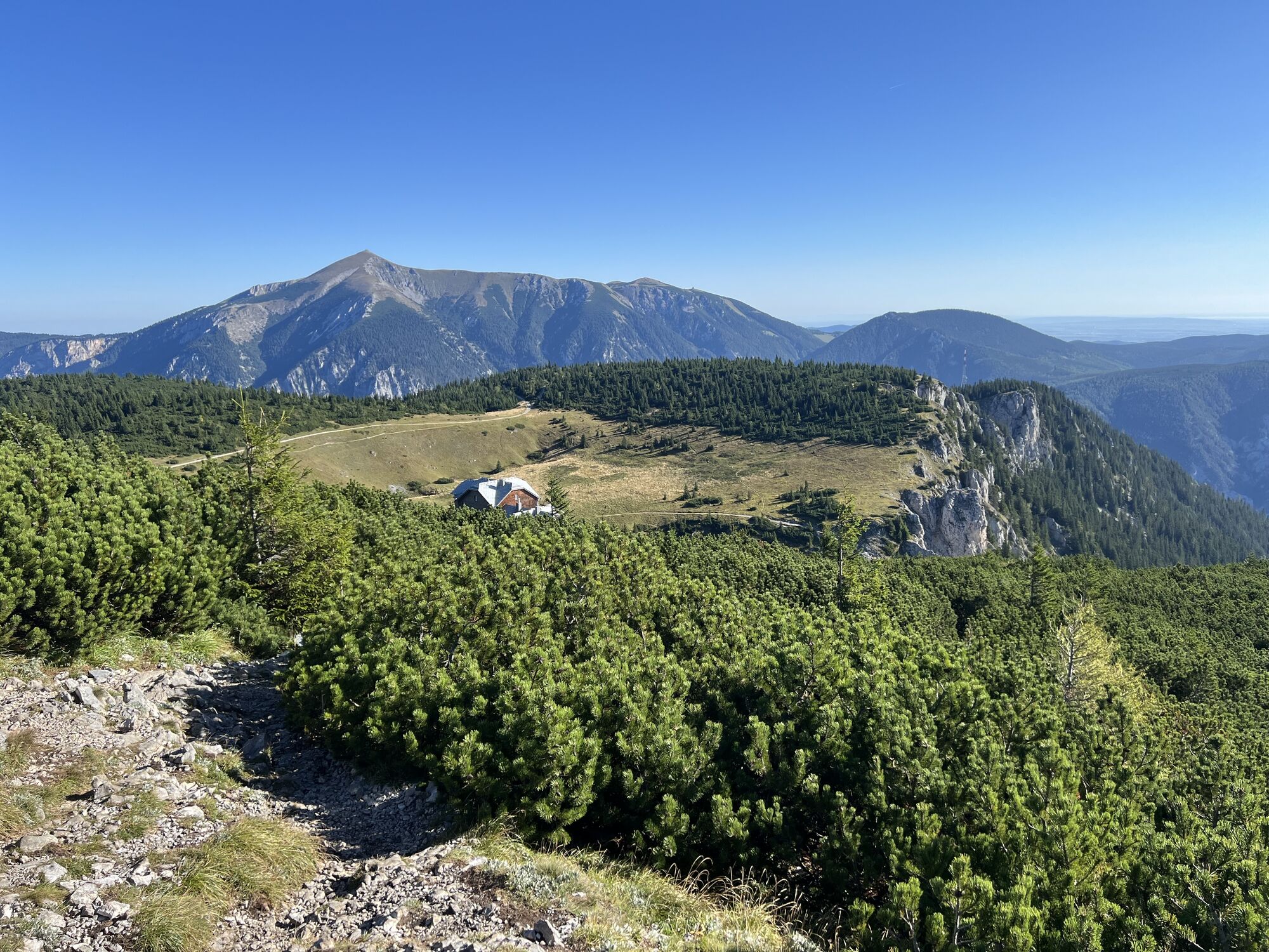 From here, you have a magnificent view of the Rax Plateau, and even the highest peak in the Rax, the Heukuppe (2007 m / 6585 ft), is clearly visible from a distance thanks to the monument erected on its summit. The Schneeberg, shining in the morning sun, is unmistakable and draws the eye. The summit was reached after just over 3.5 hours. From here, the hike continues down the north side through mountain pines to the Ottohaus, where you can stop for a well-deserved refreshment.