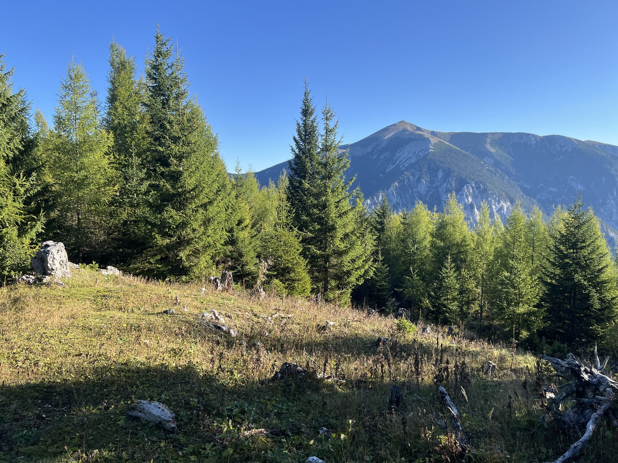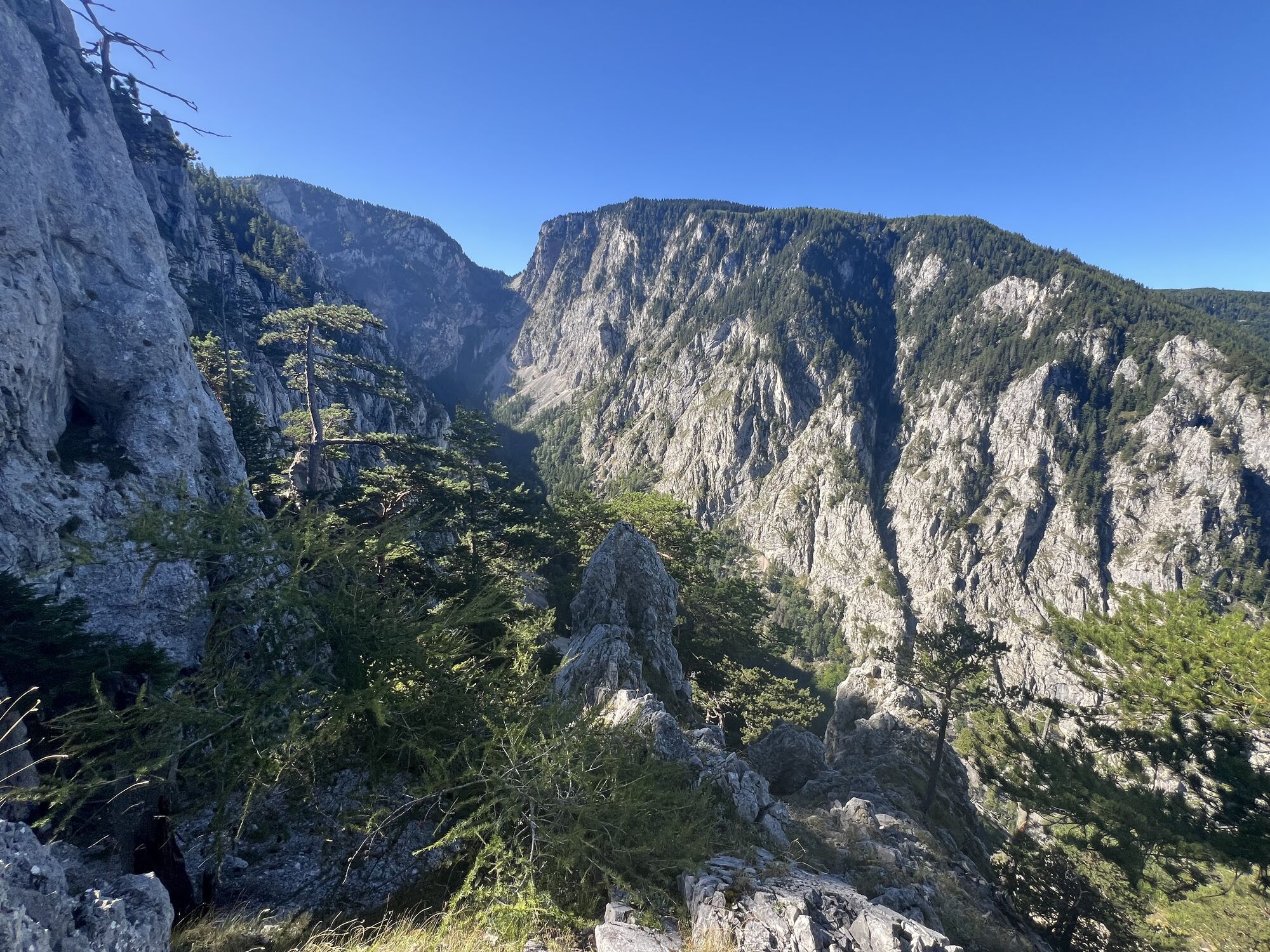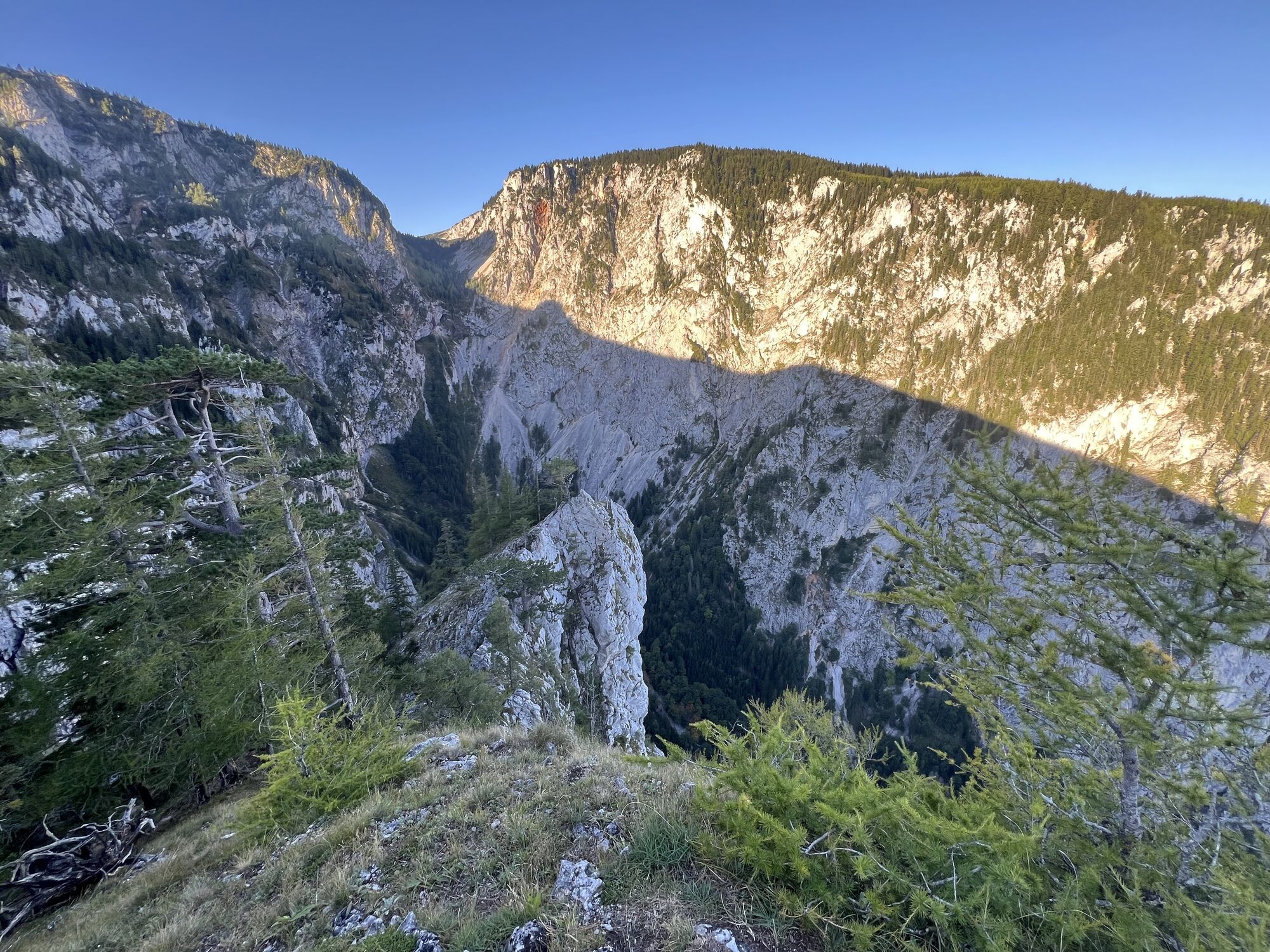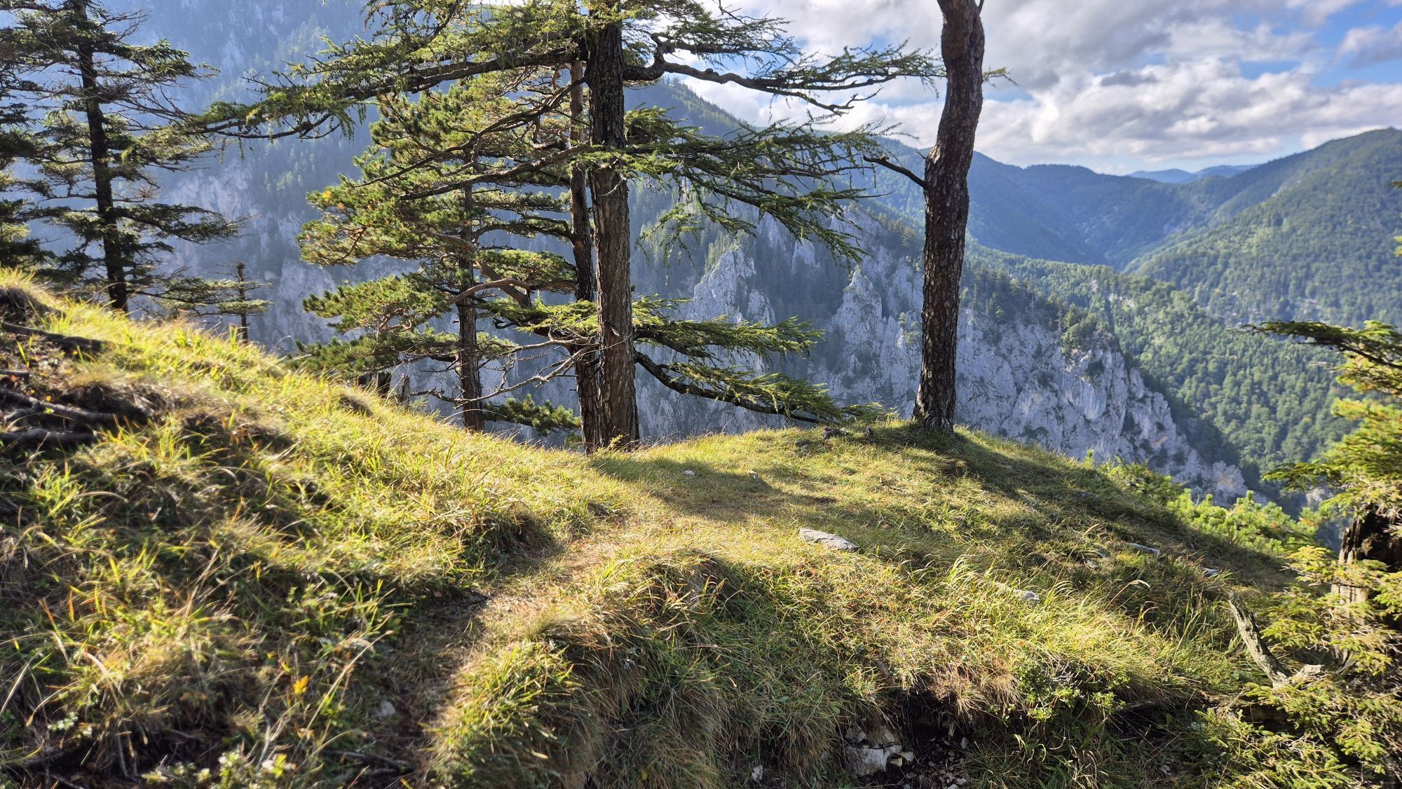 From here, you have a magnificent view of the Rax Plateau, and even the highest peak in the Rax, the Heukuppe (2007 m / 6585 ft), is clearly visible from a distance thanks to the monument erected on its summit. The Schneeberg, shining in the morning sun, is unmistakable and draws the eye. The summit was reached after just over 3.5 hours. From here, the hike continues down the north side through mountain pines to the Ottohaus, where you can stop for a well-deserved refreshment.