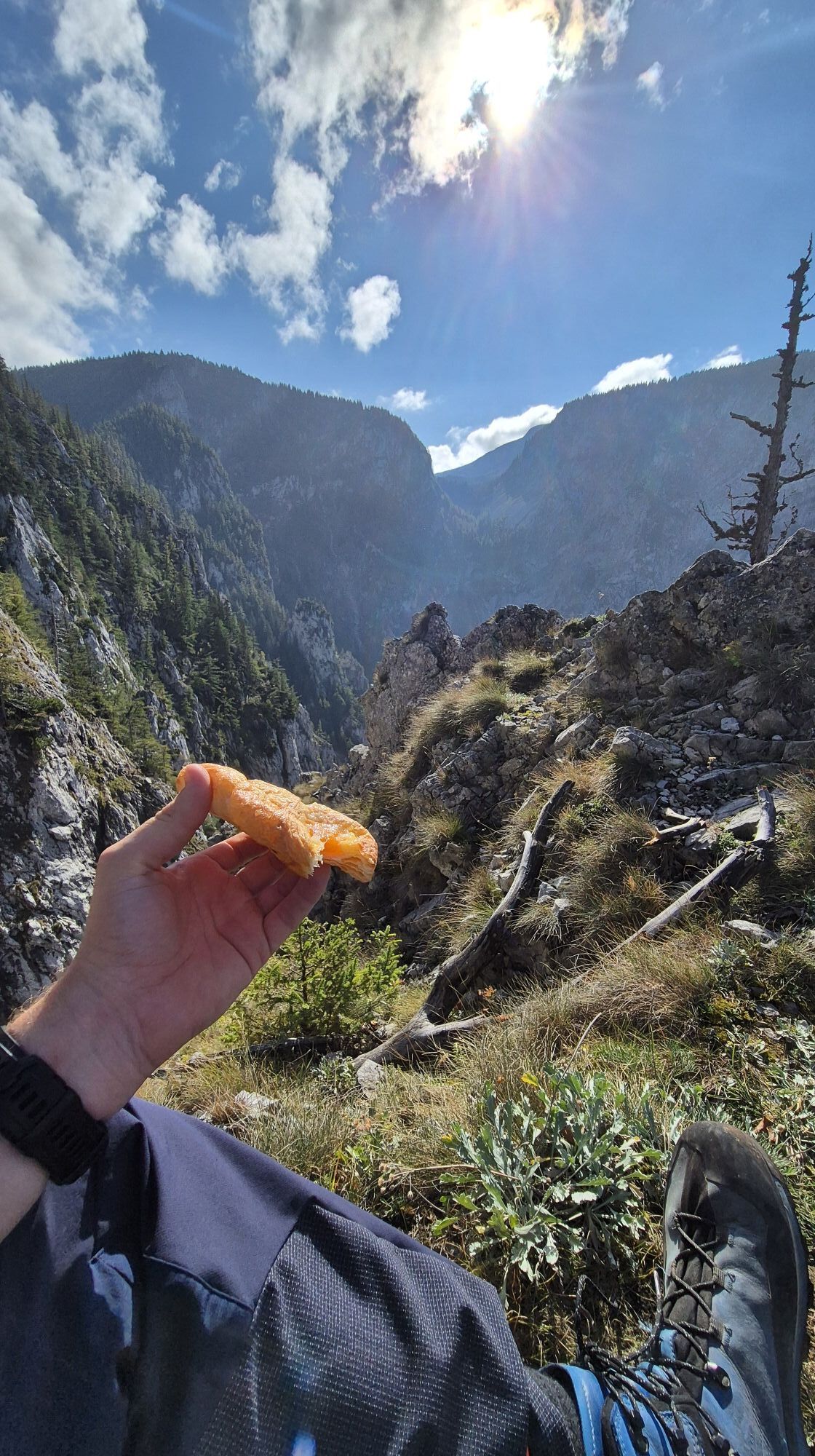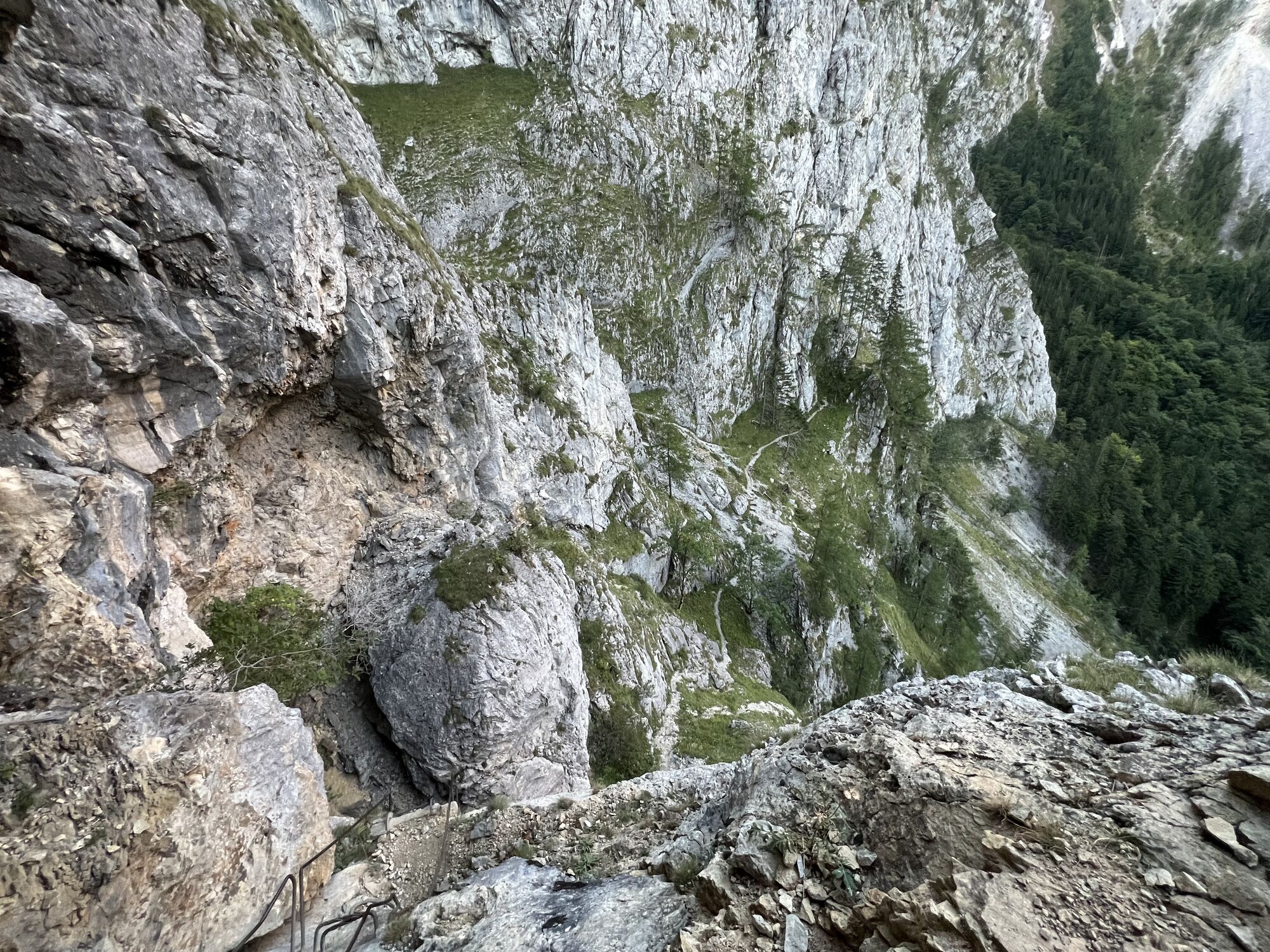 It also marks the second, somewhat more technically demanding section of the via ferrata, which finally leads through a beautiful, pleasant chimney with plenty of footholds and holds back onto easier scree terrain.