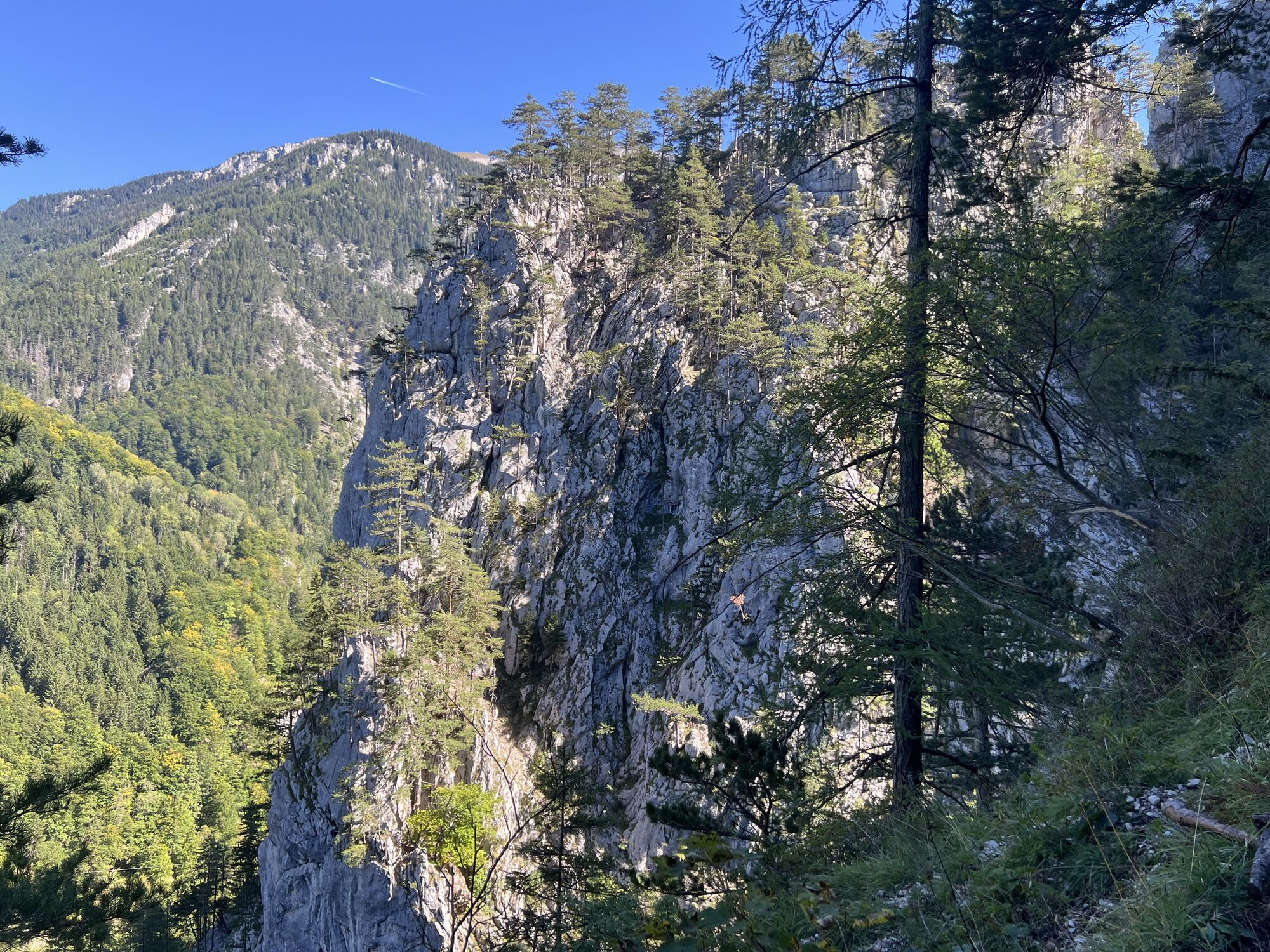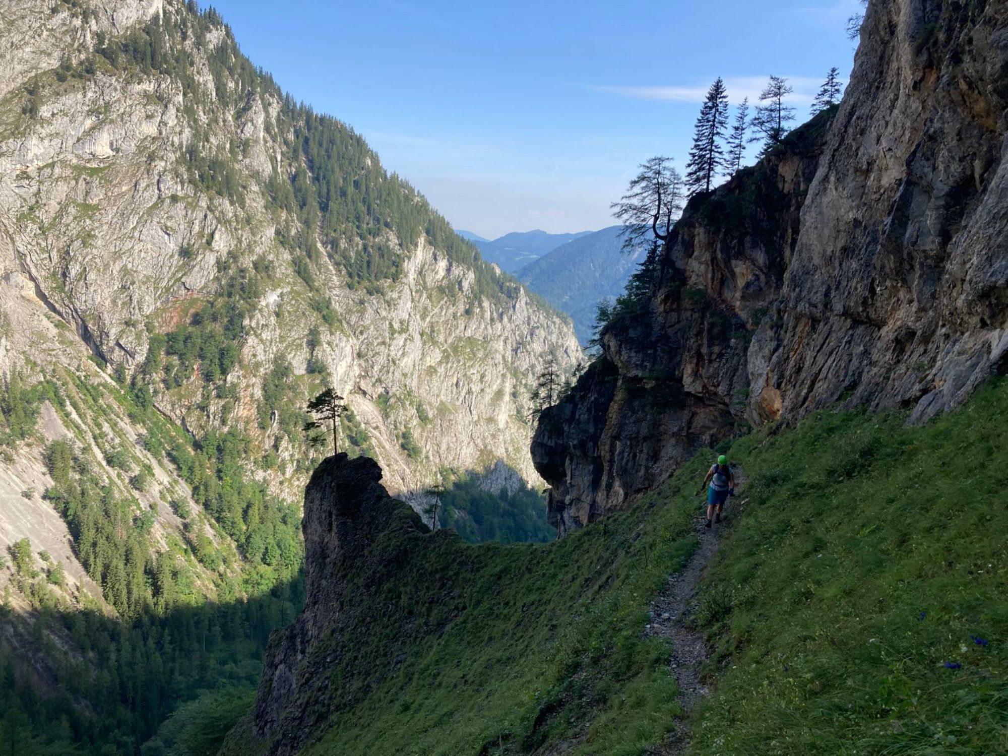 The upper part of the trail is only sporadically secured. Along the right edge of a scree gully, the path leads steadily upwards over so-called "Schrofen," rocky terrain interspersed with grass and often scree. Here, it is essential to pay attention to the red markings to avoid having to struggle up directly into the scree gully, which is extremely prone to rockfall. Wearing a rockfall helmet is definitely recommended on the Teufelsbadstubensteig. The actual scree gully is later crossed at a point secured with a steel cable. The greatest difficulties have now been overcome, and the trail winds its way further up through the forest, offering magnificent panoramic and deep views of the Großes Höllental valley at several points.