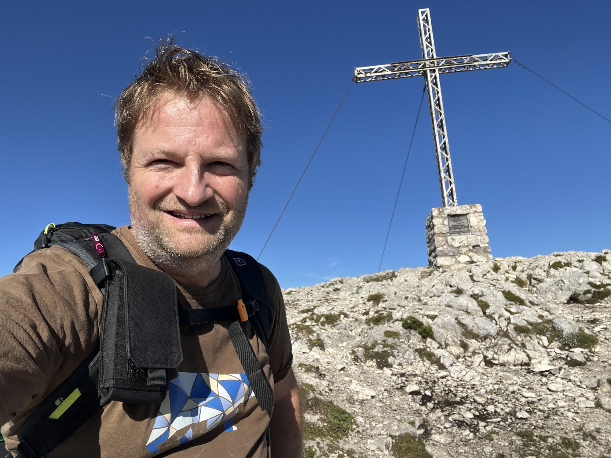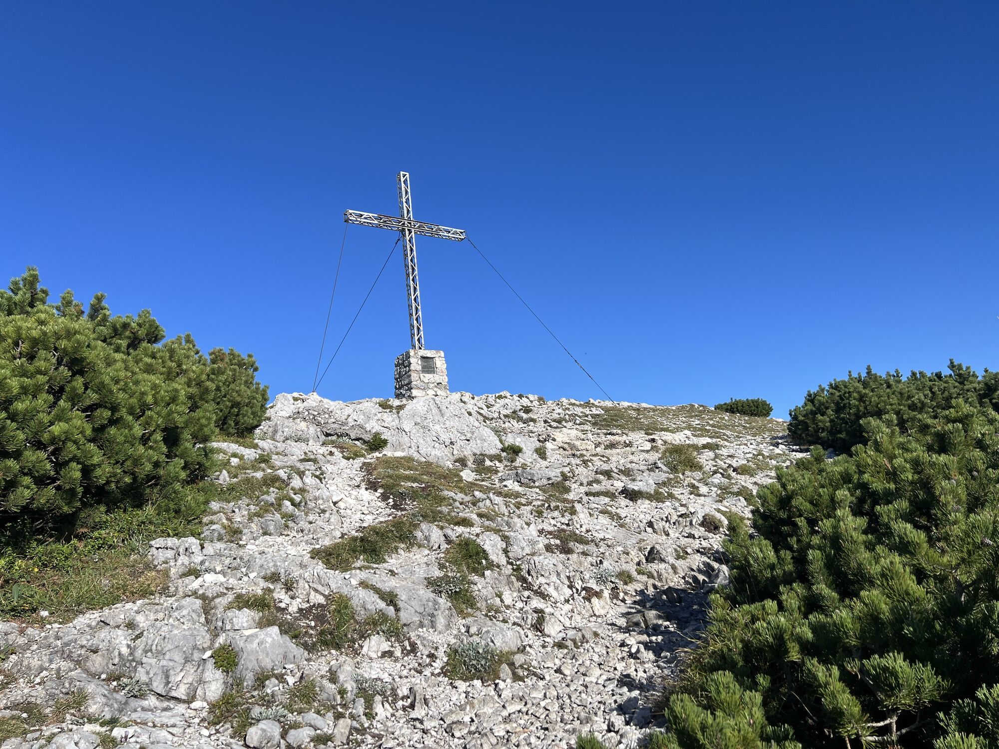 The trail continues along a wide forest road to the Ottohaus. The trail then continues through mountain pine forest, along the cliff edge, and past a viewpoint. About a 10-minute walk from the viewpoint, a path branches off to the right, leading to the summit of Jakobskogel (1737 m / 5699 ft). It's not long before you're standing in front of the imposing summit cross.