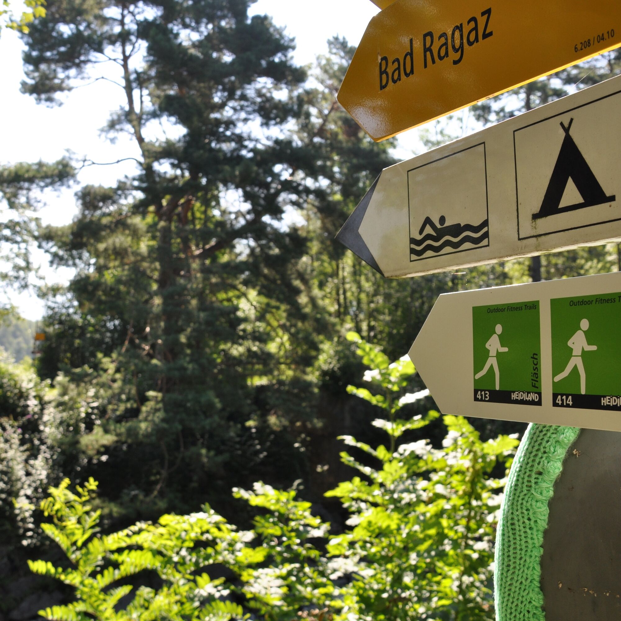 The Outdoor Fitness Trails in the Heidiland vacation region comprise over 30 uniformly signposted running trails from a total of 10 stations, forming one of the largest outdoor fitness parks in the Alps. The Rhine Trail is one of four running trails around the Bad Ragaz station.