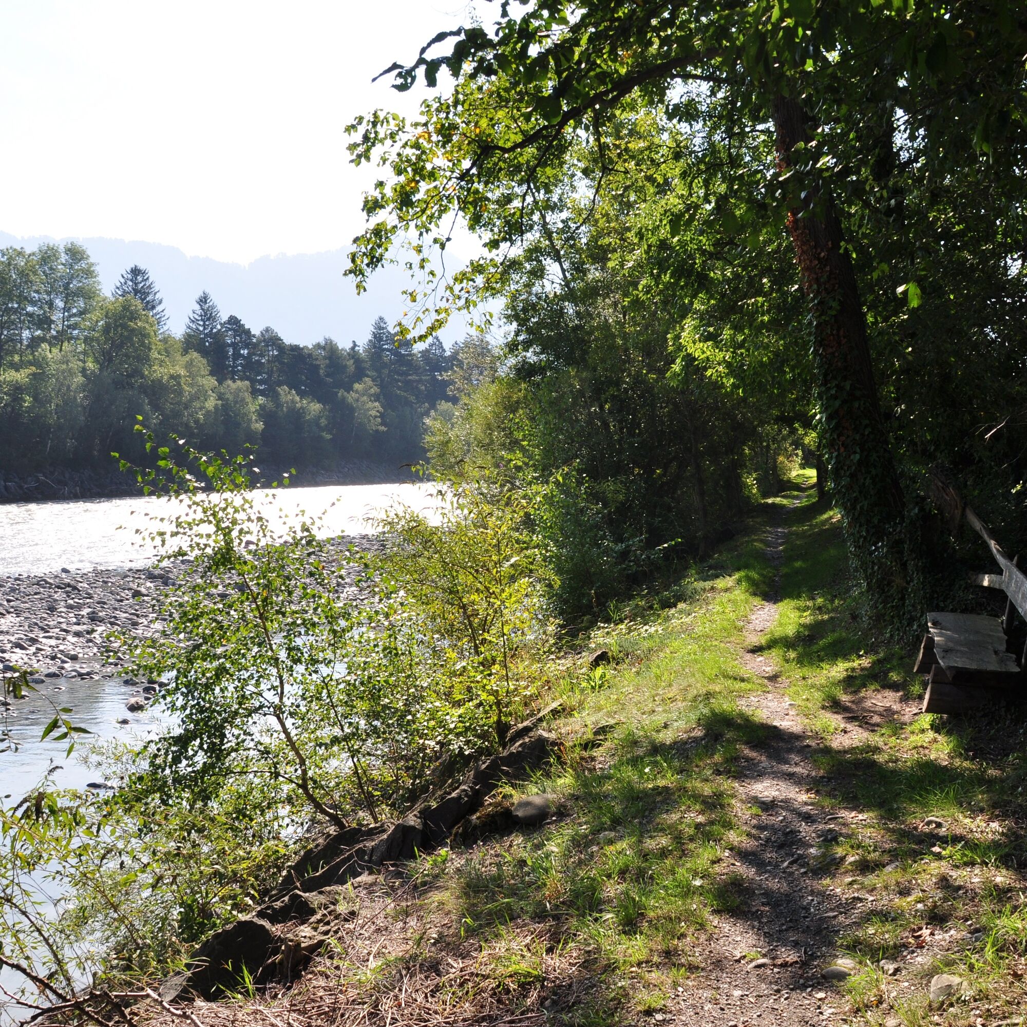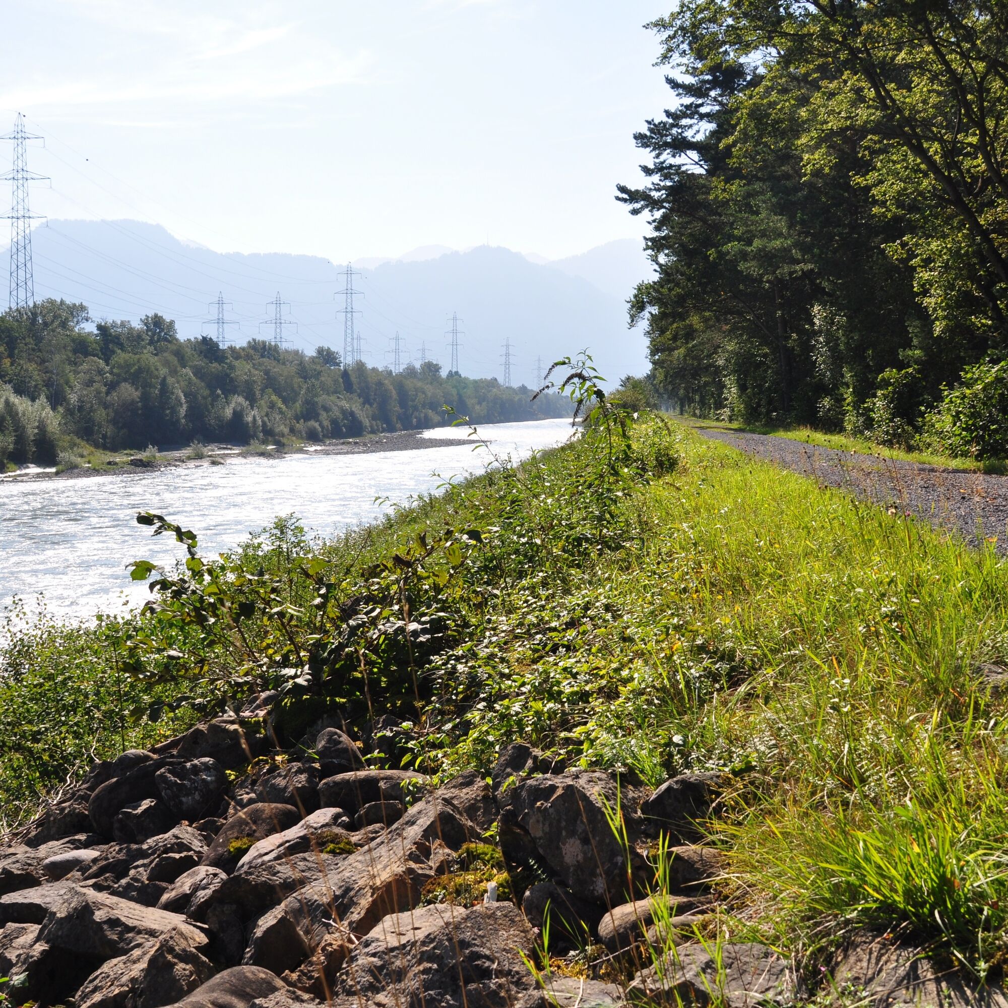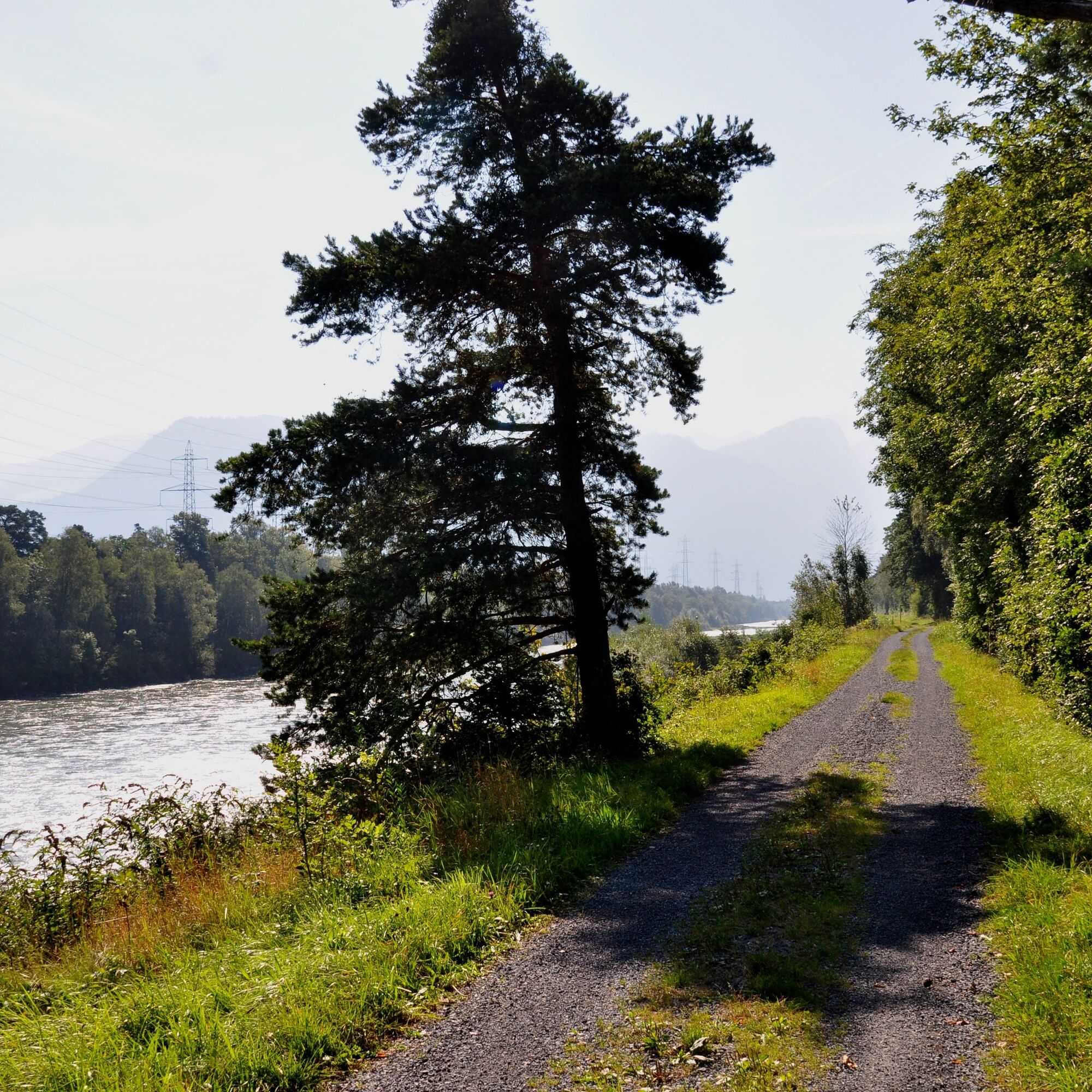 The starting point for this 11.1 km long trail is the info point at the Bad Ragaz station near the Giessenpark outdoor pool (503 m above sea level). For the first few meters, the trail runs along a wide and well-maintained gravel path through the forest to the Rhine. From there, the trail crosses the main road and then runs almost dead straight along the Rhine embankment and the edge of the forest to the Tardis bridge near Landquart (521). As soon as you have crossed the bridge, you head back towards Bad Ragaz on the other side of the Rhine. On this side of the Rhine, the road is firmer and even paved in places, making it very popular with cyclists. As the path is a few meters away from the water, it runs through the middle of a romantic mixed forest. However, the view of the Rhine is never completely blocked! After crossing the main road that connects Bad Ragaz with Maienfeld once again, the trail continues along the embankment to the level crossing at the Heidiland service station (504) The path is somewhat narrower and the forest denser on this section. Once you have crossed the Rhine, there is a short tarred section on the road leading into the village. As soon as you cross the railroad bridge, however, the trail turns back into the forest and you return to the info point at the Giessenpark outdoor pool via the Rhine dam.