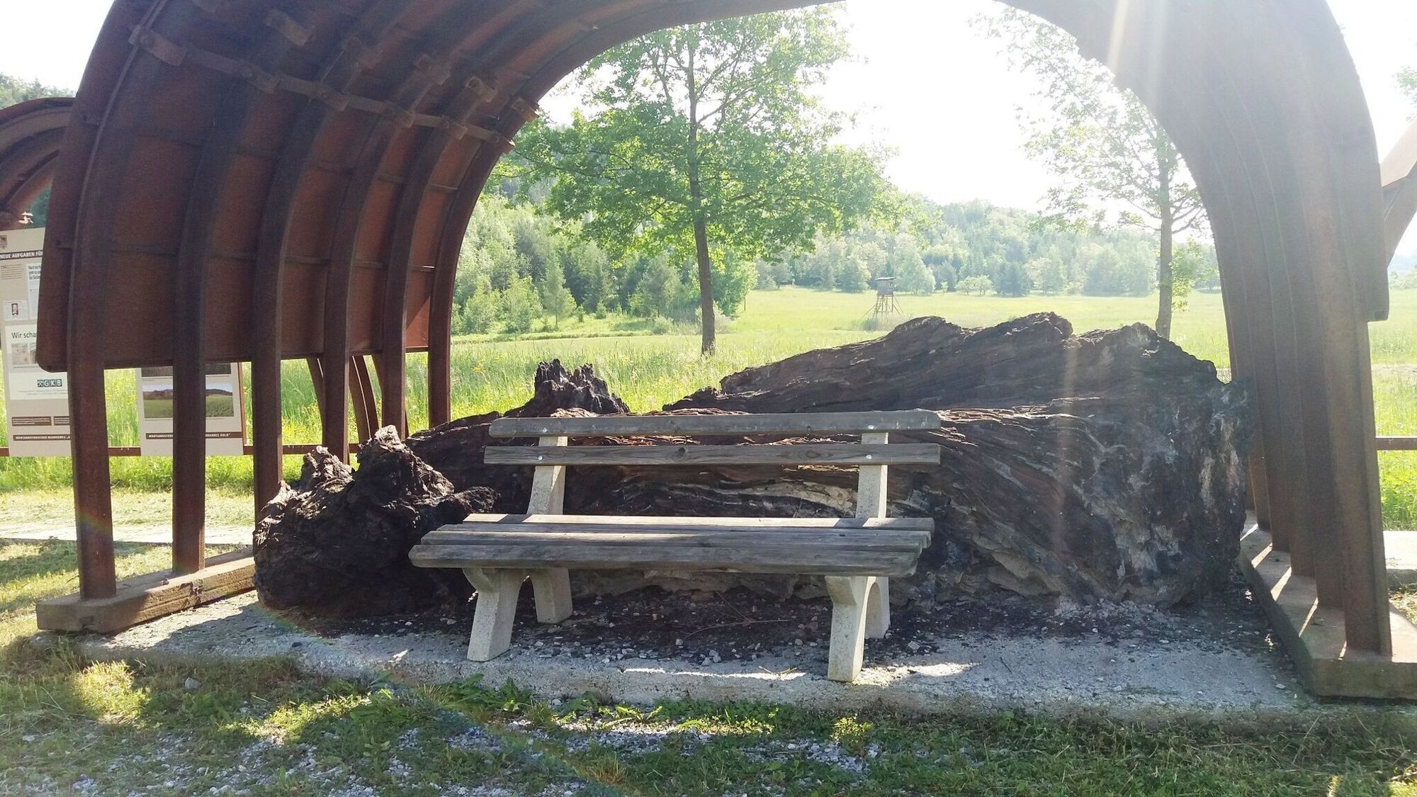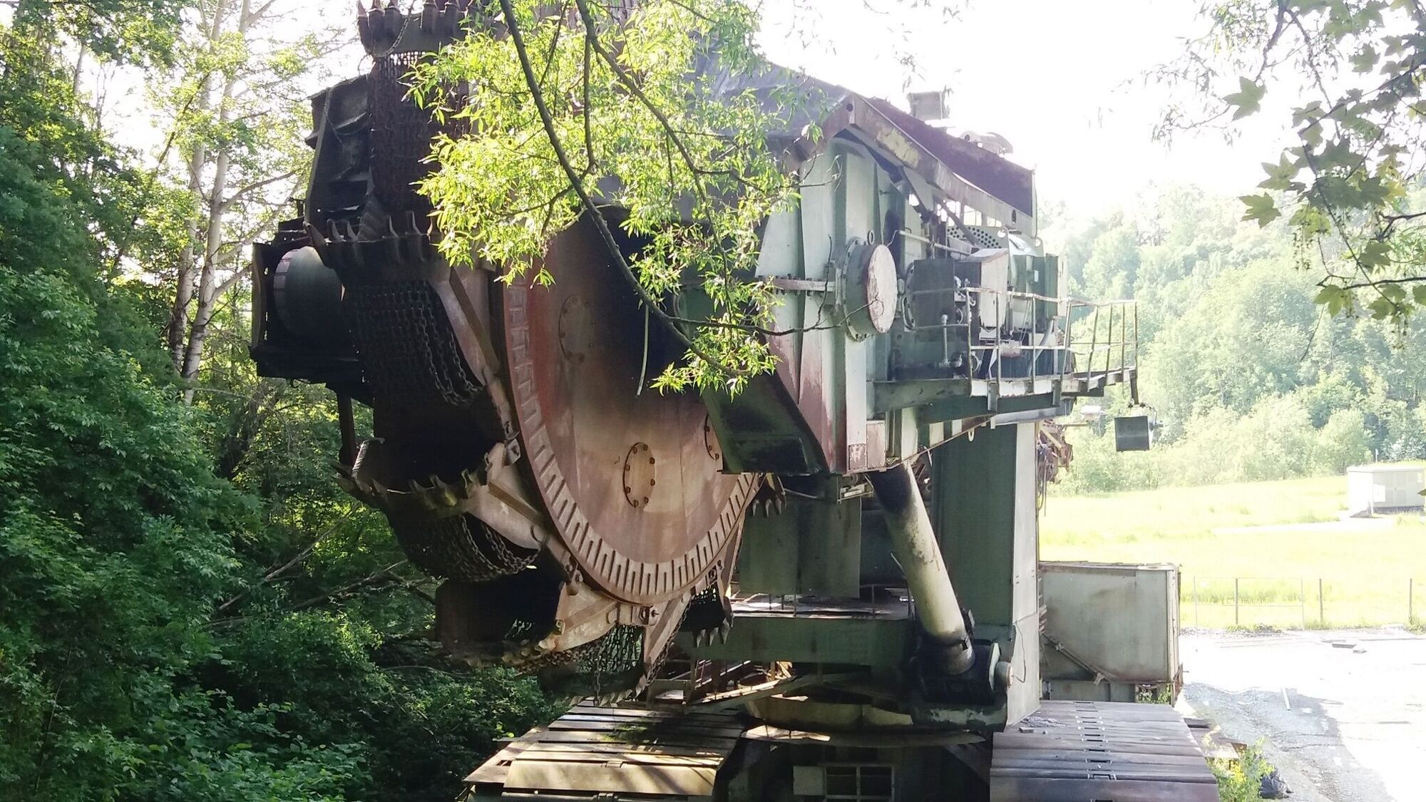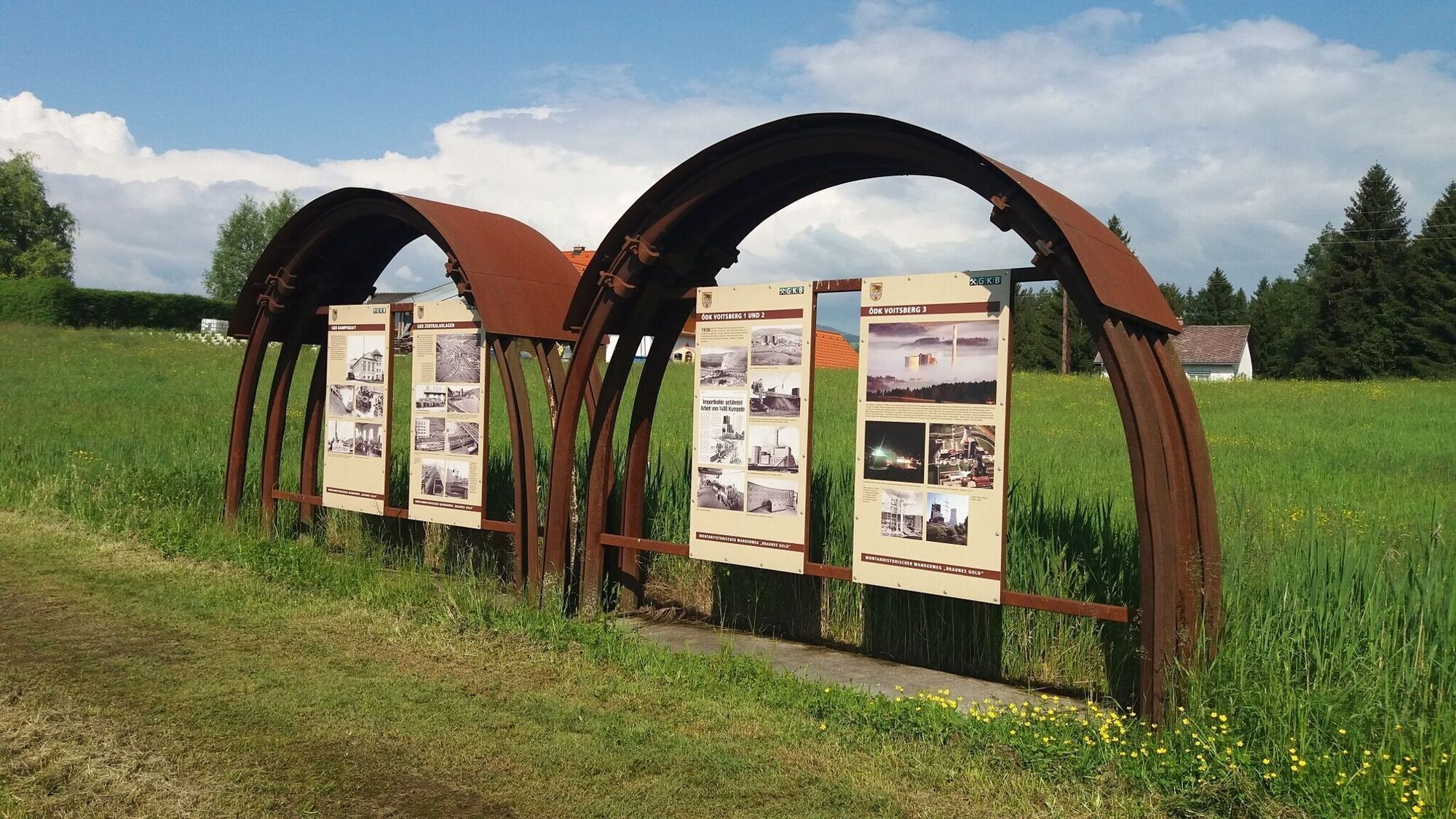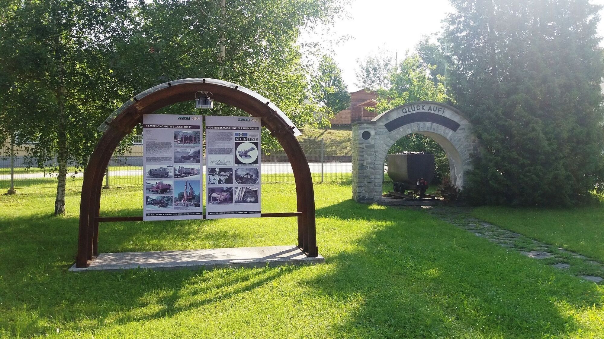 Wir gehen am Glasmuseum und der Kunstfabrik Lipizzanerheimat vorbei und biegen kurz danach rechts in das ehemalige Bergbaugelände ab. Von jetzt an begleiten uns entlang unseres Themenweges großformatige Tafeln mit kurzen Texten und eindrucksvollen Bildern. Gleichzeitig können wir auch beeindruckende Maschinen bestaunen, die uns einen Einblick in eine bedeutende aber bereits vergangene Arbeits- und Lebenswelt geben.