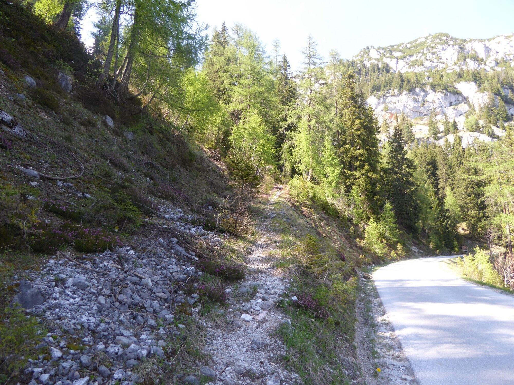 Es geht weiter bergauf vorbei am Gedankenstrich dorch den Wald zum Steiner Sprung. Die Straße queren, den Weg zum Verlobungskreuz folgen und weiter zur Kaiserwand. Nach 30m rechts auf den alten Stoderweg bis zur Stoderhütte folgen.