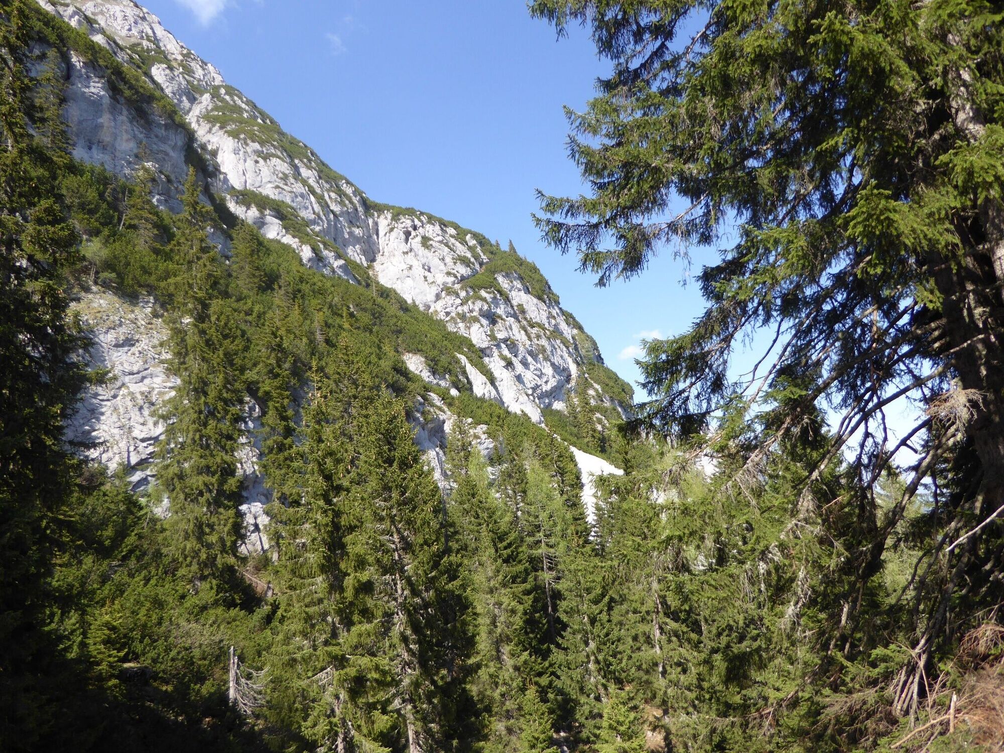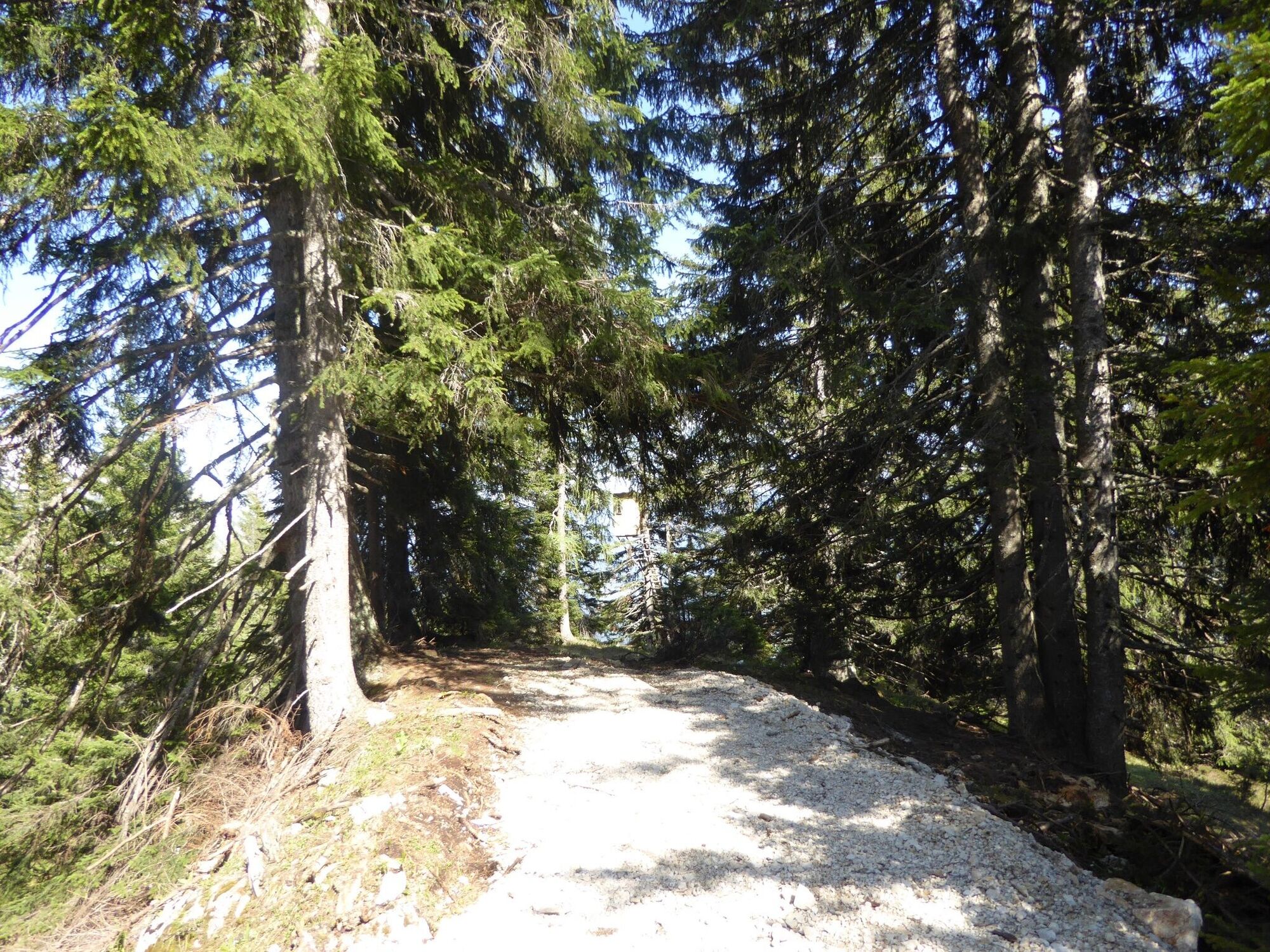 Es geht weiter bergauf vorbei am Gedankenstrich durch den Wald zum Steiner Sprung. Die Straße queren, den Weg zum Verlobungskreuz folgen und weiter zur Kaiserwand. Nach 30m rechts den alten Stoderweg bis zur Stoderhütte folgen.