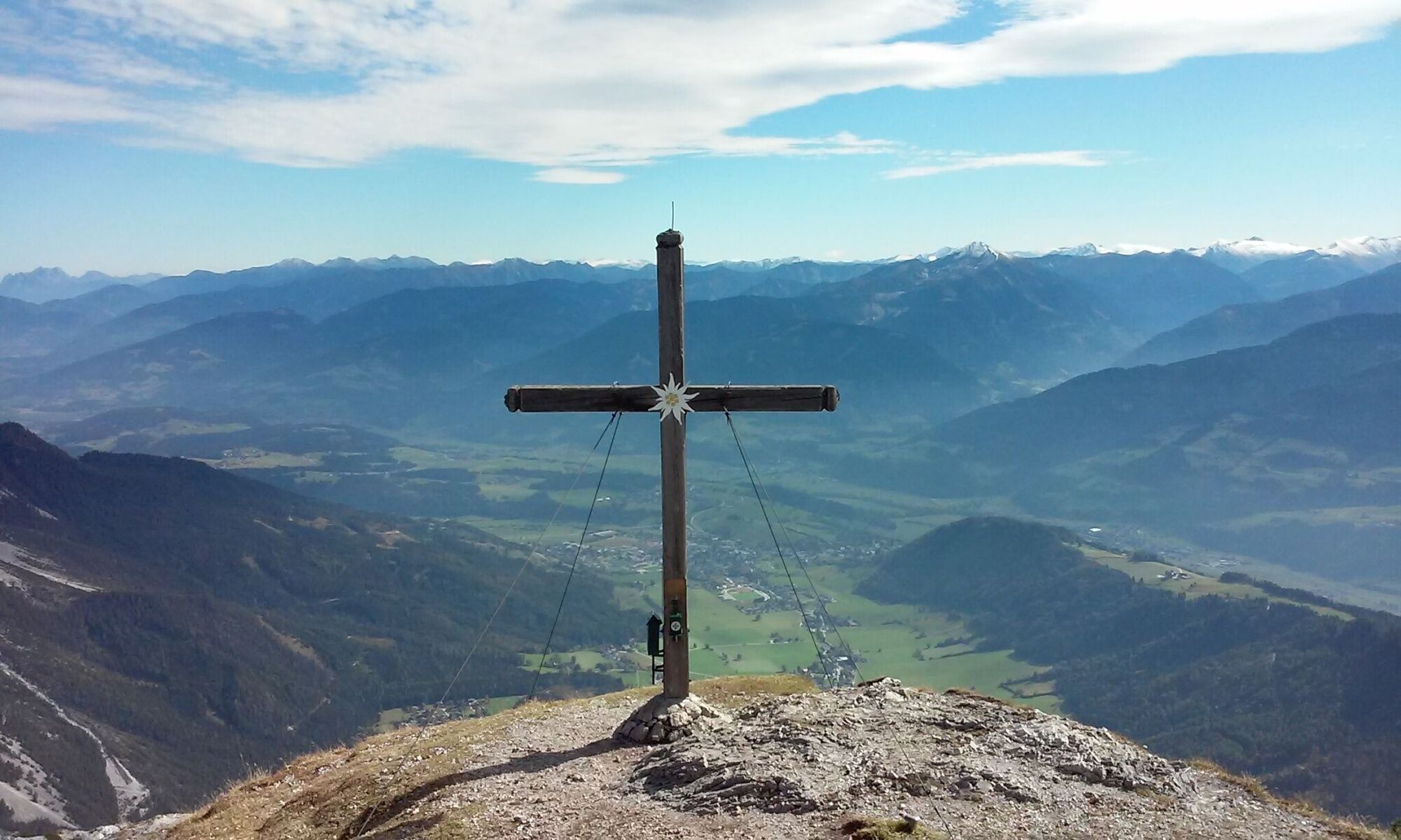 Von dort geht`s rechts leicht ansteigend hinauf bis zum Rosseggerdenkmal. Hier gibt`s dann zwei Varianten: Weiter zum Friedenskircherl und ab da nur für geübte Bergwanderer über den Florasteig zum Gipfel oder vom Rosseggerdenkmal hinauf durch den "Latschenweg" zum Gipfelkreuz Stoderzinken, wo man die herrliche Aussicht vom Dachstein bis zum Großglockner genießen kann!!
