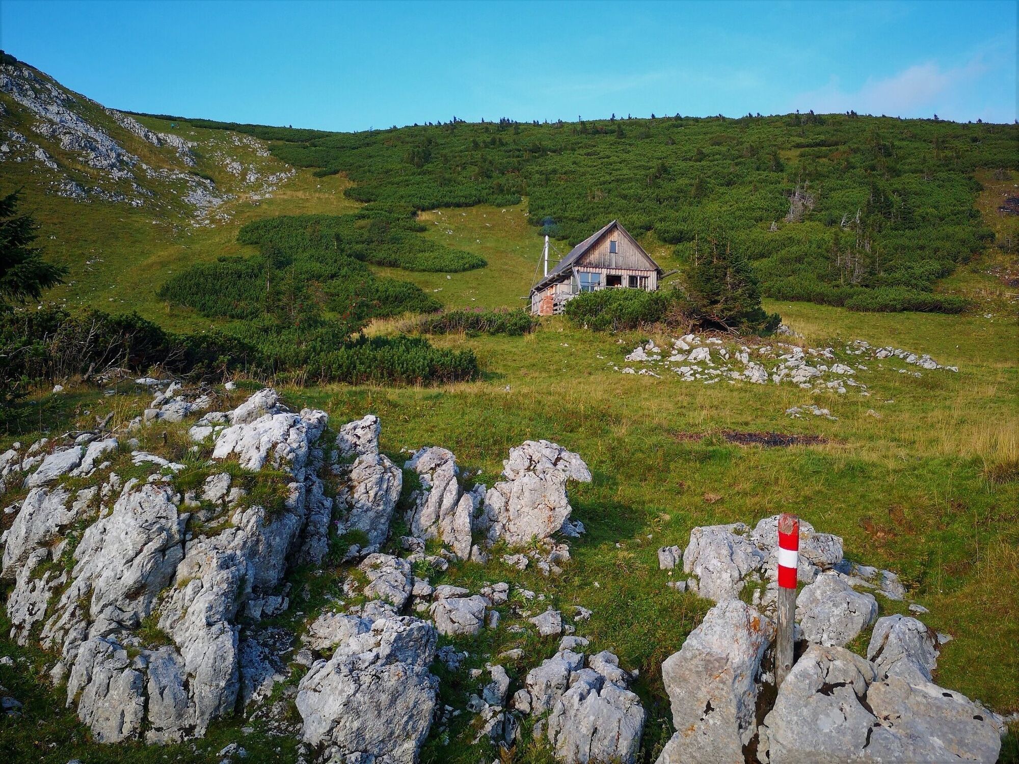 Die gemütlichere Variante führt uns von der Knopperwiese rechtshaltend auf dem markierten Weg zum Windberg (1.903m, höchster Punkt der Schneealm) und von dort abwärts zu den schon sichtbaren Schneealmhütten. Dort (Michlbauerhütte oder, etwas weiter entfernt, bei der Lurgbauerhütte oder am Schneealmhaus) machen wir gerne Rast.