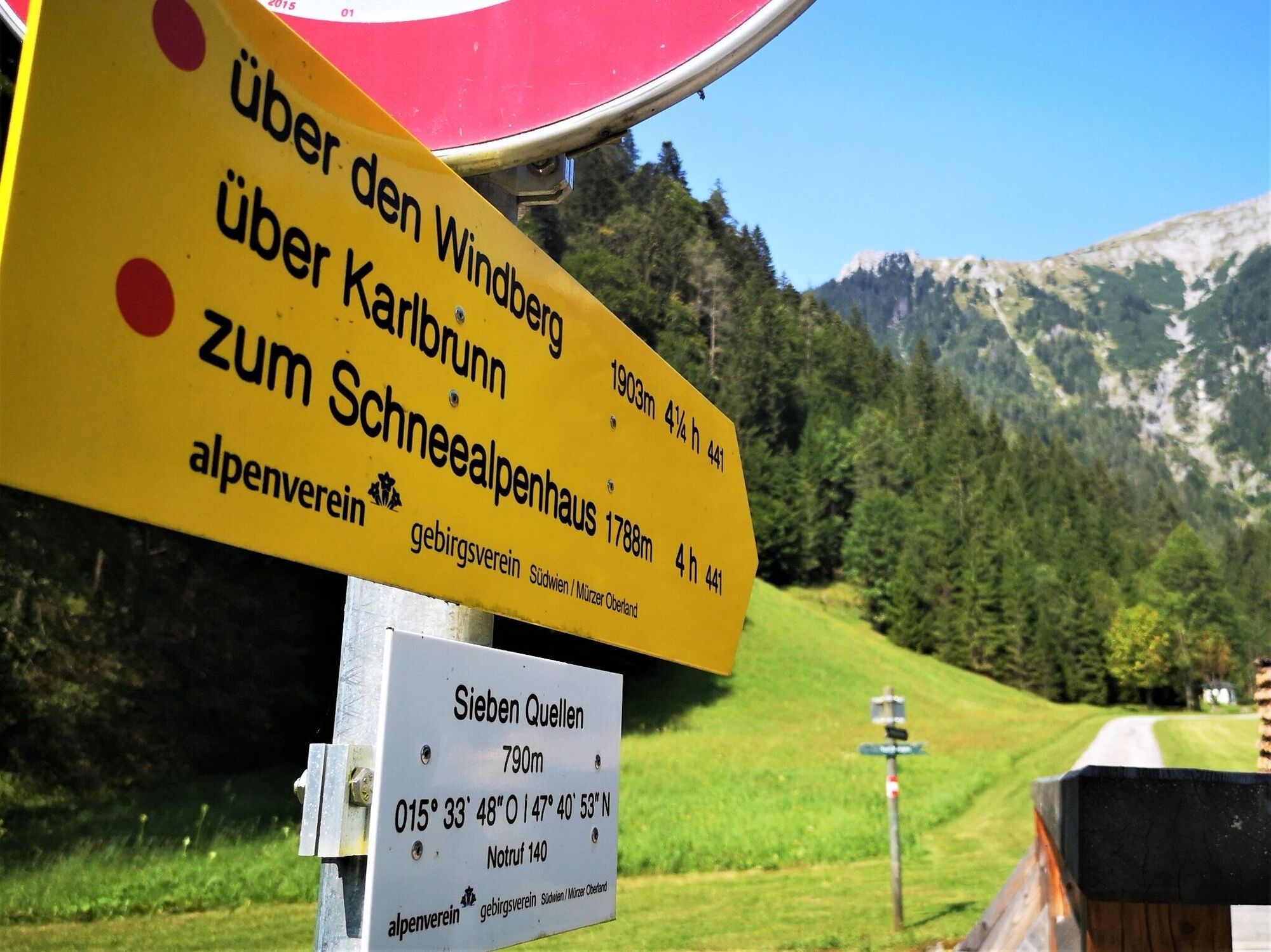 Vom Parkplatz im Karlgraben an der Quellfassung der Sieben Quellen vorbei und bei einem kleinen Klettergarten (Elisabethwandl) den Forstweg weiter verfolgend aufwärts. Bald erreichen wir den markierten und immer steiler werdenden Steig durch den Karlgraben. Diesem Steig folgen wir, alle unmarkierten Abzweigungen ignorierend, immer aufwärts. An einer Quelle vorbei geht es bald oberhalb der Baumgrenze in eine karähnliche Mulde.