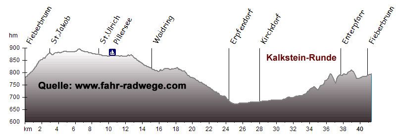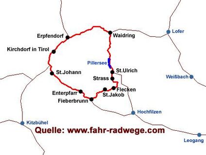 Am Pillersee vorbei und durch die Öfenschlucht geht es bis Waidring, Erpfendorf,St.Johann und wieder zurück nach Fieberbrunn.