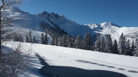 Am Onkeljochlift (3er Sessellift) steigen wir dann den verschneiten Wanderweg zum Arzjochspeicher. Vor Uns tut sich dann ein Wunderschöner Blick Richtung Spieljoch und Kellerjoch auf