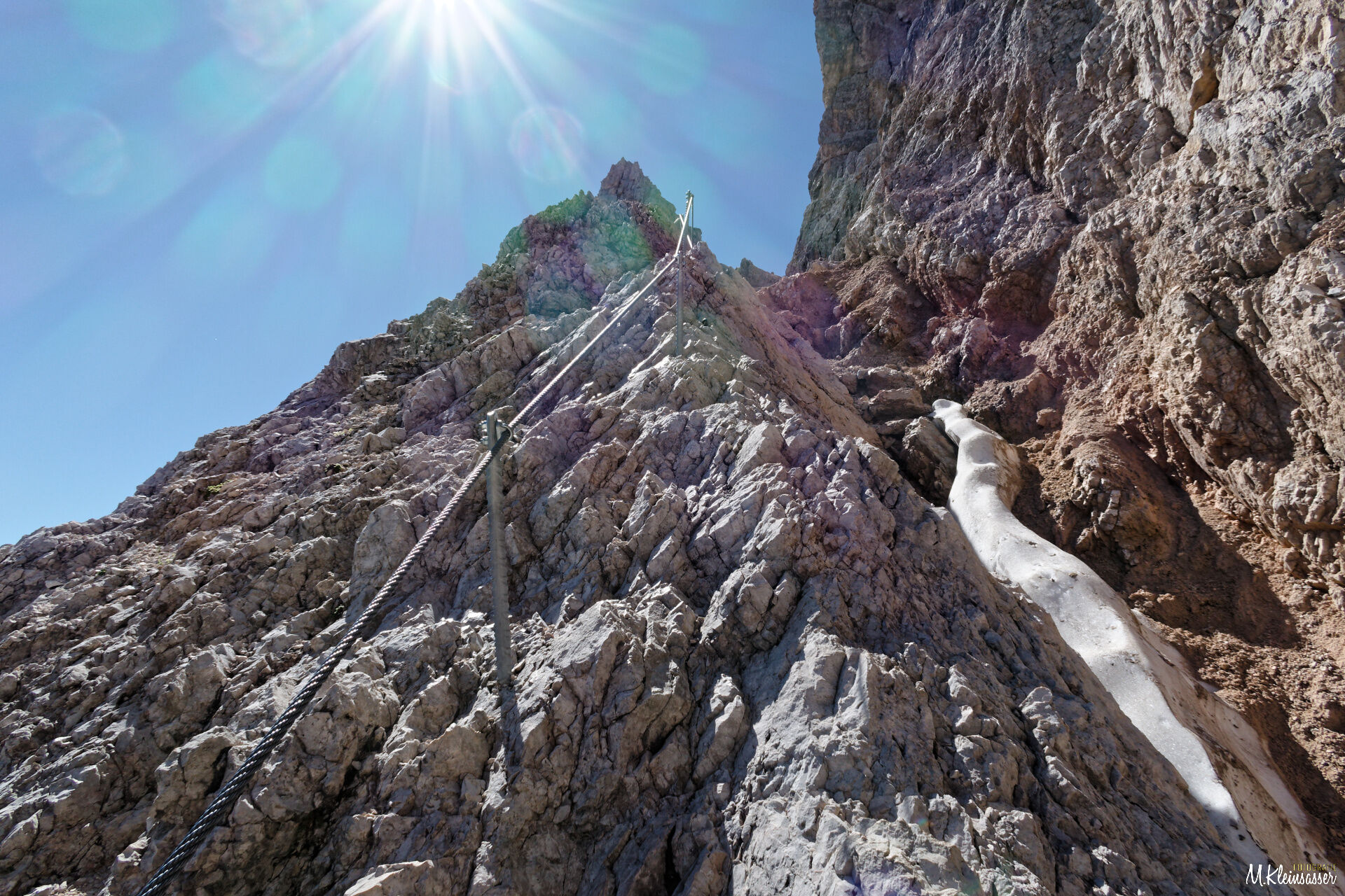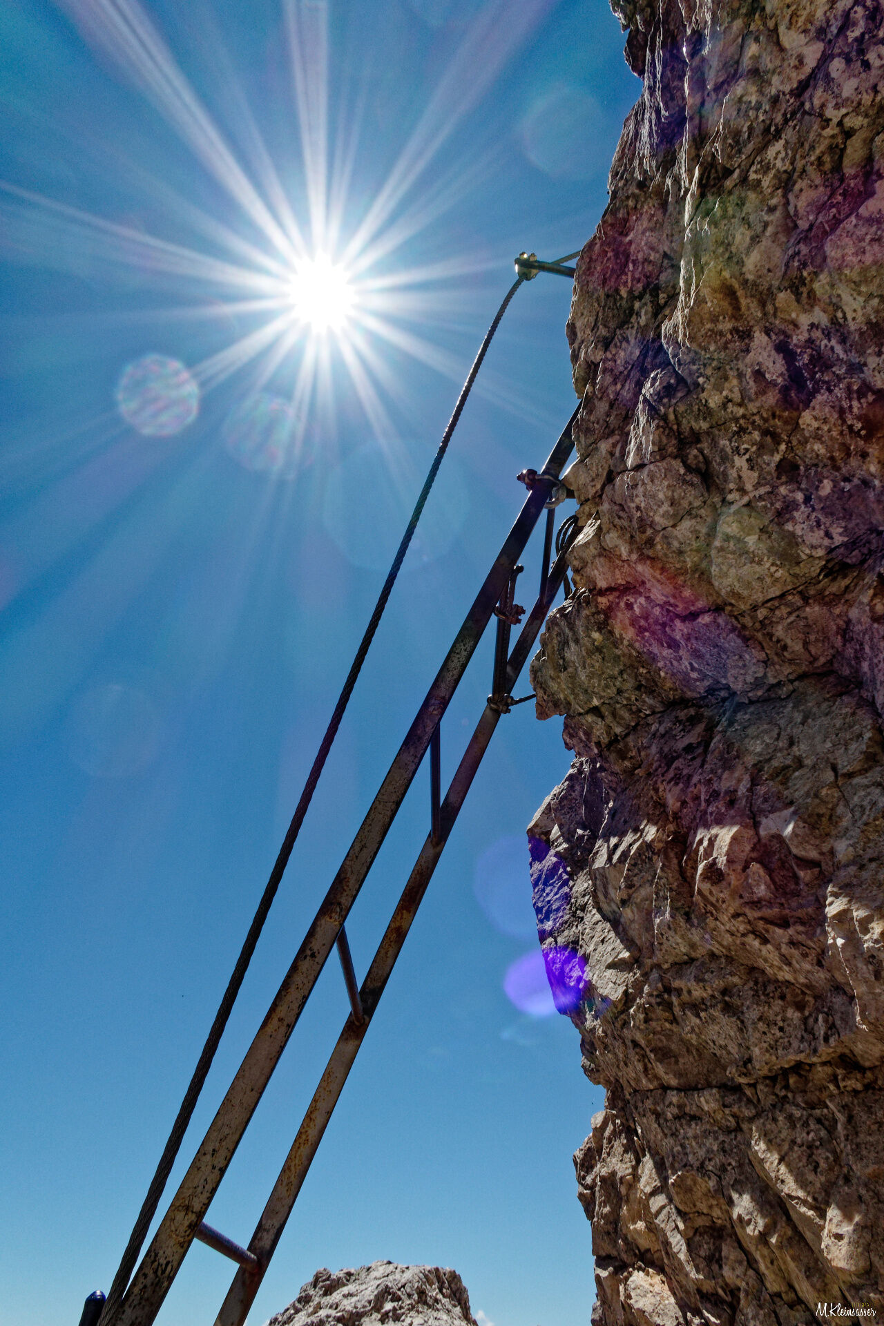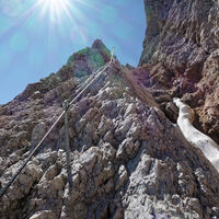 Dieser ist größtenteils versichert mit Stahlseilen und Trittbügeln bis Schwierigkeit B.